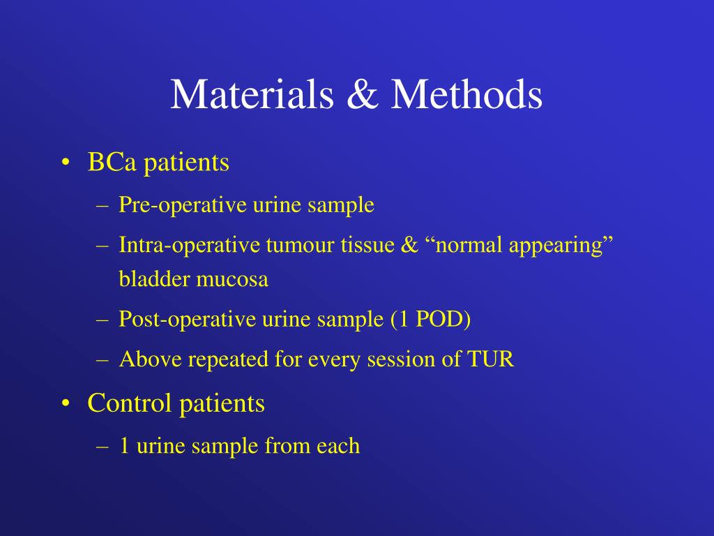Materials & Methods • BCa patients • Pre-operative urine sample • Intra-operative tumour tissue & “normal appearing” bladder mucosa • Post-operative urine sample (1 POD) • Above repeated for every session of TUR • Control patients • 1 urine sample from each