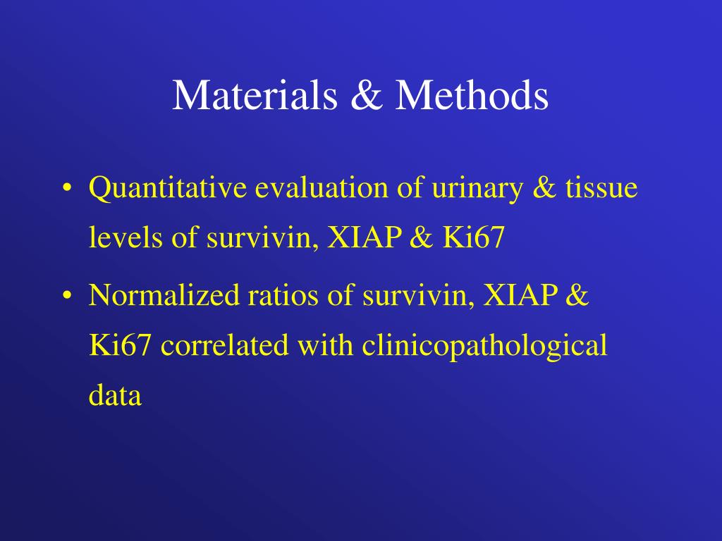 Materials & Methods • Quantitative evaluation of urinary & tissue levels of survivin, XIAP & Ki67 • Normalized ratios of survivin, XIAP & Ki67 correlated with clinicopathological data
