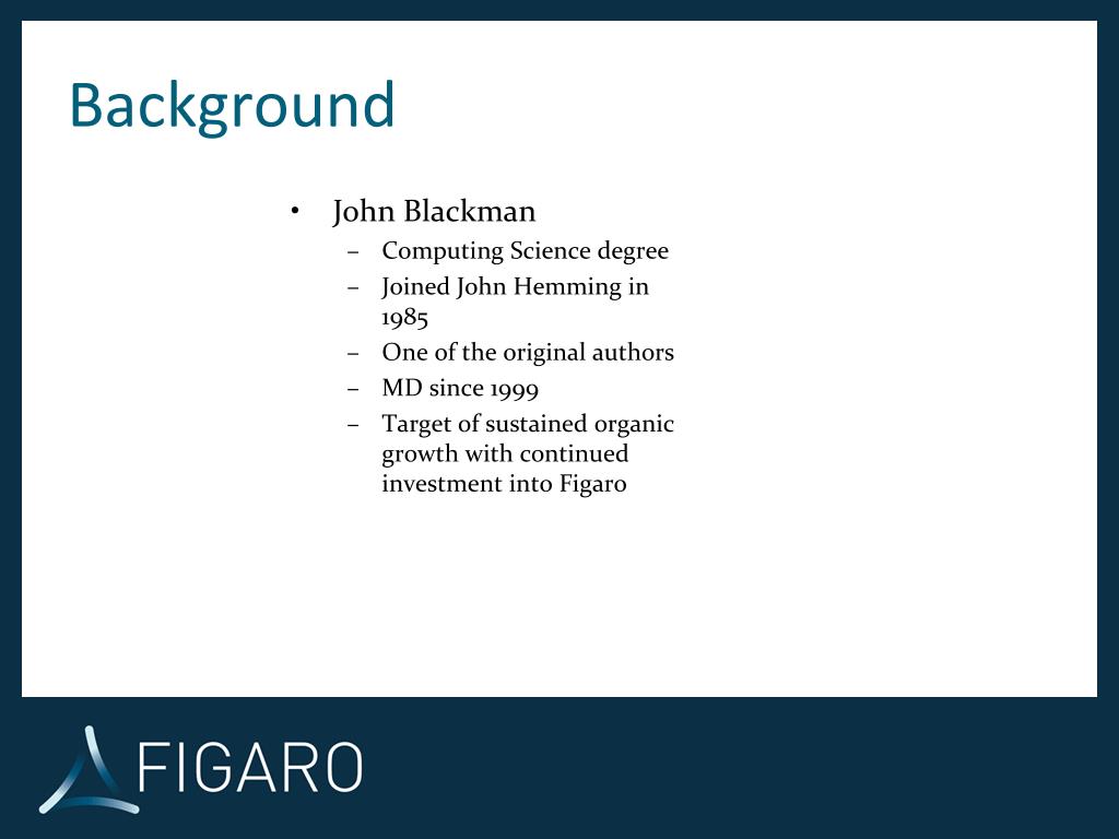 Background • John Blackman • Computing Science degree • Joined John Hemming in 1985 • One of the original authors • MD since 1999 • Target of sustained organic growth with continued investment into Figaro