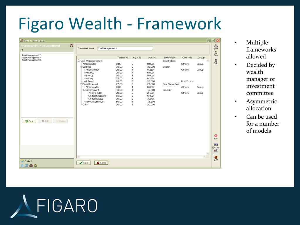 Figaro Wealth - Modelling • Create model within framework • Allocate actual assets within the hierarchy • and show when assets satisfy the framework