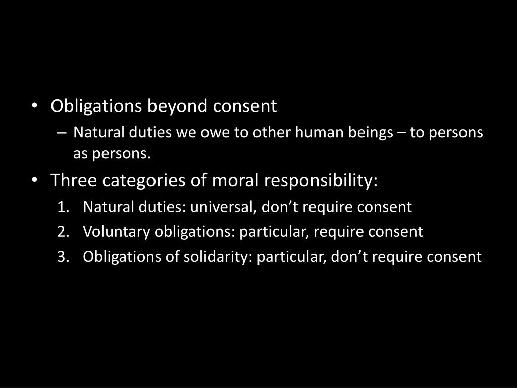 Obligations beyond consent • Natural duties we owe to other human beings – to persons as persons. • Three categories of moral responsibility: • Natural duties: universal, don’t require consent • Voluntary obligations: particular, require consent • Obligations of solidarity: particular, don’t require consent