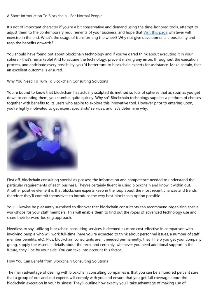 A Short Introduction To Blockchain - For Normal People It's not of important character if you're a bit conservative and demand using the time-honored tools, attempt to adjust them to the contemporary requirements of your business, and hope that Visit this page whatever will exercise in the end. What's the usage of transforming the wheel? Why not give developments a possibility and reap the benefits onwards? You should have found out about blockchain technology and if you've dared think about executing it in your sphere - that's remarkable! And to acquire the technology, prevent making any errors throughout the execution process, and anticipate every possibility, you 'd better turn to blockchain experts for assistance. Make certain, that an excellent outcome is ensured. Why You Need To Turn To Blockchain Consulting Solutions You're bound to know that blockchain has actually sculpted its method so lots of spheres that as soon as you get down to counting them, you stumble quite quickly. Why so? Blockchain technology supplies a plethora of choices together with benefits to its users who aspire to explore this innovative tool. However prior to entering upon, you're highly motivated to get expert specialists' services, and let's determine why. First off, blockchain consulting specialists possess the information and competence needed to understand the particular requirements of each business. They're certainly fluent in using blockchain and know it within out. Another positive element is that blockchain experts keep in the loop about the most recent chances and trends, therefore they'll commit themselves to introduce the very best blockchain option possible. You'll likewise be pleasantly surprised to discover that blockchain consultants can recommend organizing special workshops for your staff members. This will enable them to find out the ropes of advanced technology use and share their forward-looking approach. Needless to say, utilizing blockchain consulting services is deemed as more cost-effective in comparison with involving people who will work full-time (here you're expected to think about personnel issues, a number of staff member benefits, etc). Plus, blockchain consultants aren't needed permanently: they'll help you get your company going, supply the essential details about the tech, and certainly, whenever you need additional support in the future, they'll be by your side. You can take into account this factor. How You Can Benefit from Blockchain Consulting Solutions The main advantage of dealing with blockchain consulting companies is that you can be a hundred percent sure that a group of out-and-out experts will comply with you and ensure that you get full coverage about the blockchain execution in your business. They'll outline how exactly you'll take advantage of making use of