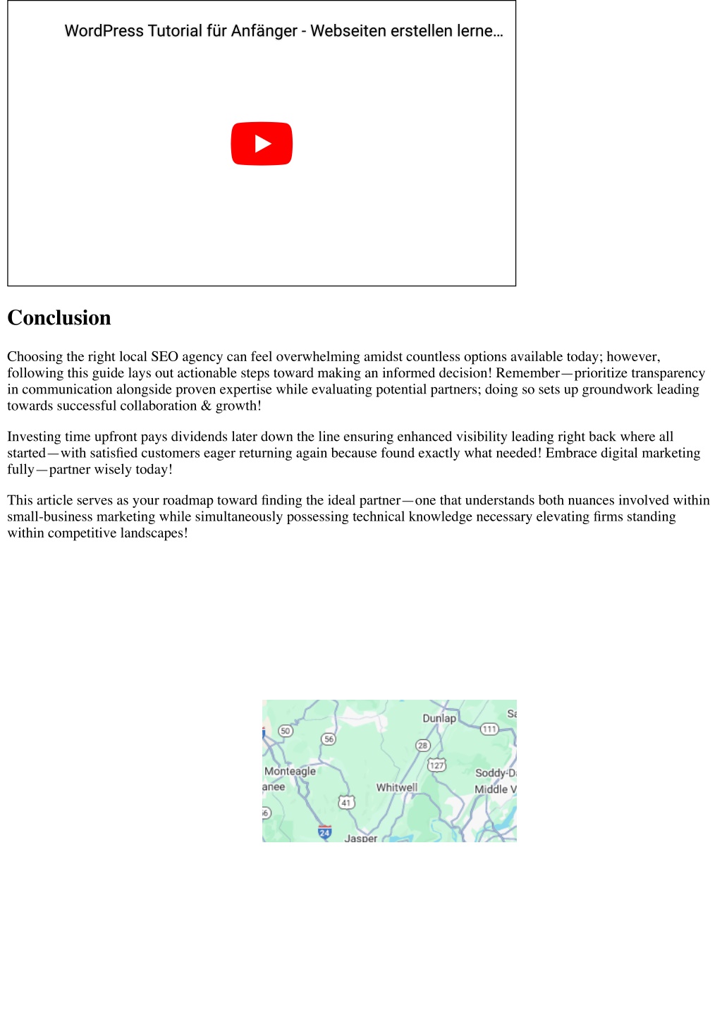 WordPress Tutorial für Anfänger - Webseiten erstellen lerne WordPress Tutorial für Anfänger - Webseiten erstellen lerne… … Conclusion Choosing the right local SEO agency can feel overwhelming amidst countless options available today; however, following this guide lays out actionable steps toward making an informed decision! Remember—prioritize transparency in communication alongside proven expertise while evaluating potential partners; doing so sets up groundwork leading towards successful collaboration & growth! Investing time upfront pays dividends later down the line ensuring enhanced visibility leading right back where all started—with satisfied customers eager returning again because found exactly what needed! Embrace digital marketing fully—partner wisely today! This article serves as your roadmap toward finding the ideal partner—one that understands both nuances involved within small-business marketing while simultaneously possessing technical knowledge necessary elevating firms standing within competitive landscapes!