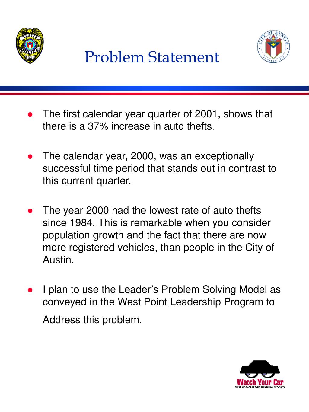 Problem Statement • The first calendar year quarter of 2001, shows that there is a 37% increase in auto thefts. • The calendar year, 2000, was an exceptionally successful time period that stands out in contrast to this current quarter. • The year 2000 had the lowest rate of auto thefts since 1984. This is remarkable when you consider population growth and the fact that there are now more registered vehicles, than people in the City of Austin. • I plan to use the Leader’s Problem Solving Model as conveyed in the West Point Leadership Program to Address this problem.