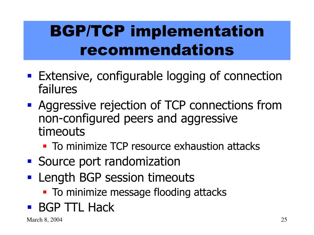 BGP/TCP implementation recommendations • Extensive, configurable logging of connection failures • Aggressive rejection of TCP connections from non-configured peers and aggressive timeouts • To minimize TCP resource exhaustion attacks • Source port randomization • Length BGP session timeouts • To minimize message flooding attacks • BGP TTL Hack