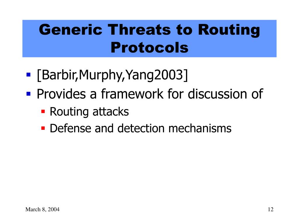 Generic Threats to Routing Protocols • [Barbir,Murphy,Yang2003] • Provides a framework for discussion of • Routing attacks • Defense and detection mechanisms