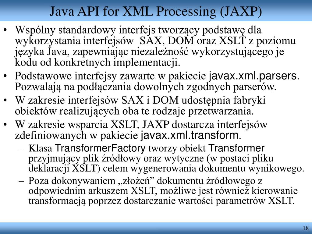 DOM a SAX - podsumowanie • Interfejs DOM: • Odtwarza strukturę dokumentu w pamięci; • Umożliwia modyfikację dokumentu; • Pozwala na swobodny dostęp i nawigowanie w dowolnym kierunku; • Znaczne wymagania odnośnie zasobów: efektywny dla niewielkich dokumentów. • Interfejs SAX: • Nie pozwala na modyfikację struktury dokumentu; • Przetwarzanie strumieniowe zapewnia sprawność nawet dla dużych dokumentów; • Dostęp do dokumentu za pomocą tego interfejsu uchodzi za trudniejszy. 17