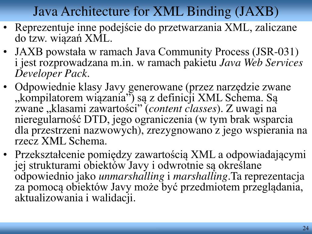 Java Architecture for XML Binding (JAXB) • Reprezentuje inne podejście do przetwarzania XML, zaliczane do tzw. wiązań XML. • JAXB powstała w ramach Java Community Process (JSR-031)i jest rozprowadzana m.in. w ramach pakietu Java Web Services Developer Pack. • Odpowiednie klasy Javy generowane (przez narzędzie zwane „kompilatorem wiązania”) są z definicji XML Schema. Są zwane „klasami zawartości” (content classes). Z uwagi na nieregularność DTD, jego ograniczenia (w tym brak wsparcia dla przestrzeni nazwowych), zrezygnowano z jego wspierania na rzecz XML Schema. • Przekształcenie pomiędzy zawartością XML a odpowiadającymi jej strukturami obiektów Javy i odwrotnie są określane odpowiednio jako unmarshalling i marshalling.Ta reprezentacja za pomocą obiektów Javy może być przedmiotem przeglądania, aktualizowania i walidacji. 24