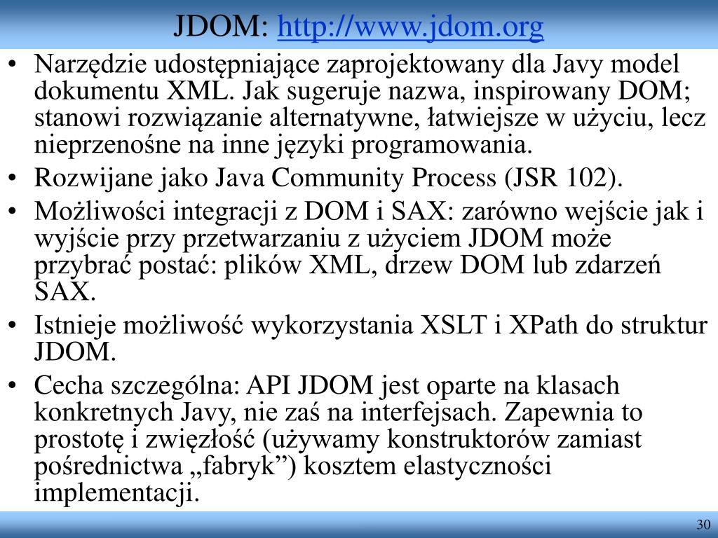 DOM a Java • Document Object Model powstał jako specyfikacja niezależna od konkretnego jezyka programowania i zapewniająca dostęp do kompletnej zawartości dokumentu. • Z puktu widzenia wykorzystania w Javie posiada on pewne wady: • Znaczna konsumpcja zasobów: szczegółowa reprezentacja dokumentu jest w całości odtwarzania w pamięci. • Brak wykorzystania udogodnień specyficznych dla Javy, jak przeciążanie, Collection Framework. • Wobec tego podjęto prace nad interfejsami dla Javy, które za cenę genryczności mogłyby osiągnąć lepszą wygodę wykorzystania i mniejszą konsumpcję zasobów, jednak bardziej elastycznymi niż wymagająca statycznej wiedzy o schemacie JAXB. 29