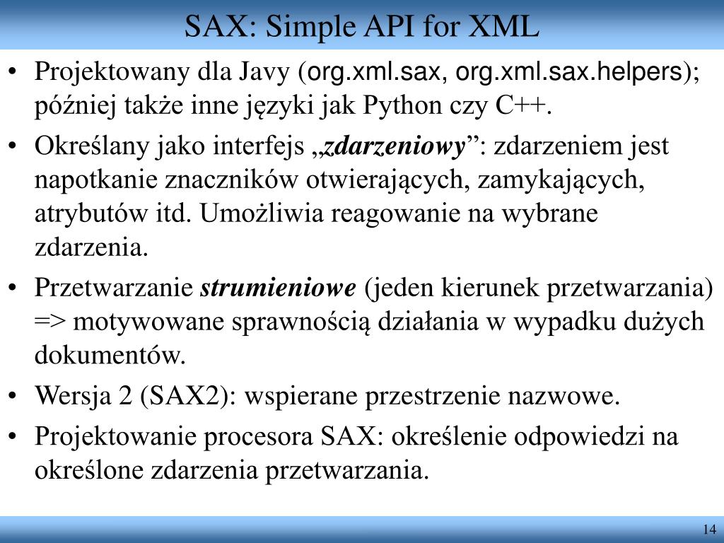 SAX: Simple API for XML • Projektowany dla Javy (org.xml.sax, org.xml.sax.helpers); później także inne języki jak Python czy C++. • Określany jako interfejs „zdarzeniowy”: zdarzeniem jest napotkanie znaczników otwierających, zamykających, atrybutów itd. Umożliwia reagowanie na wybrane zdarzenia. • Przetwarzanie strumieniowe (jeden kierunek przetwarzania) => motywowane sprawnością działania w wypadku dużych dokumentów. • Wersja 2 (SAX2): wspierane przestrzenie nazwowe. • Projektowanie procesora SAX: określenie odpowiedzi na określone zdarzenia przetwarzania. 14