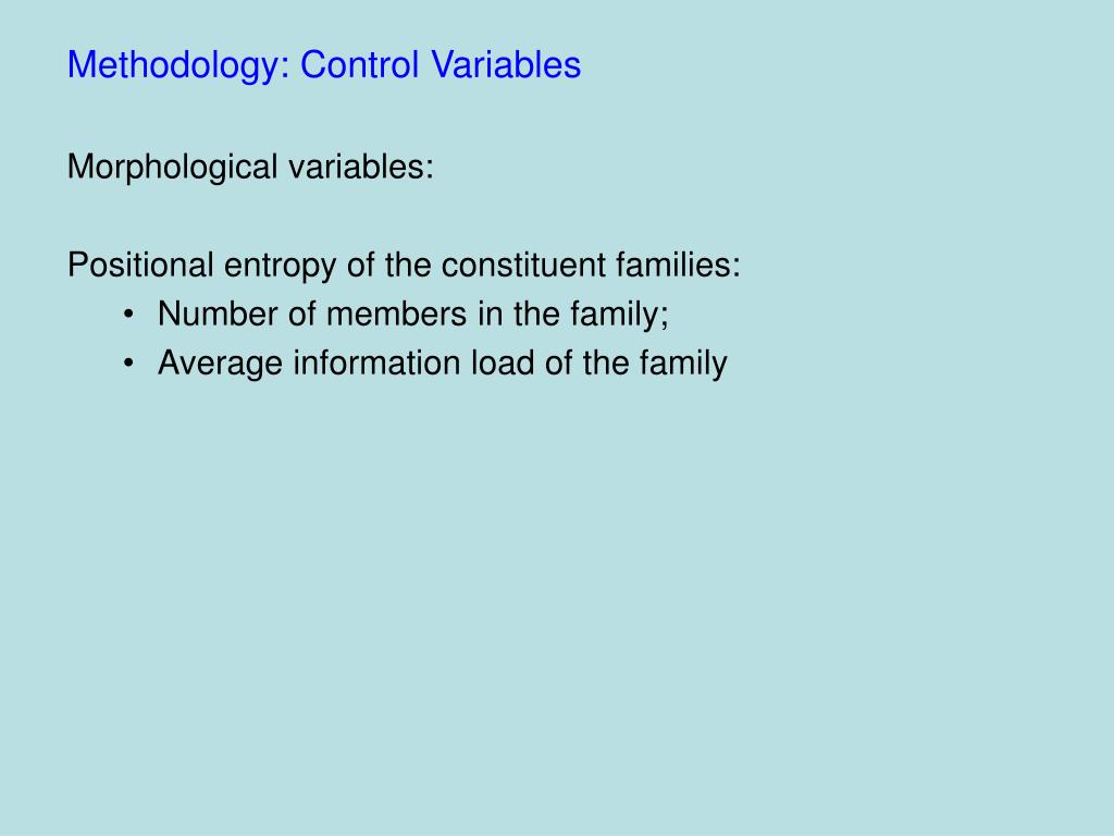 Methodology: Control Variables Morphological variables: Positional entropy of the constituent families: • Number of members in the family; • Average information load of the family