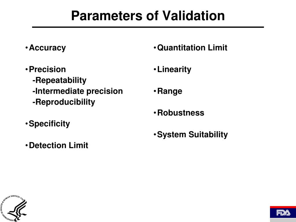 Accuracy Precision -Repeatability -Intermediate precision -Reproducibility Specificity Detection Limit Quantitation Limit Linearity Range Robustness System Suitability Parameters of Validation