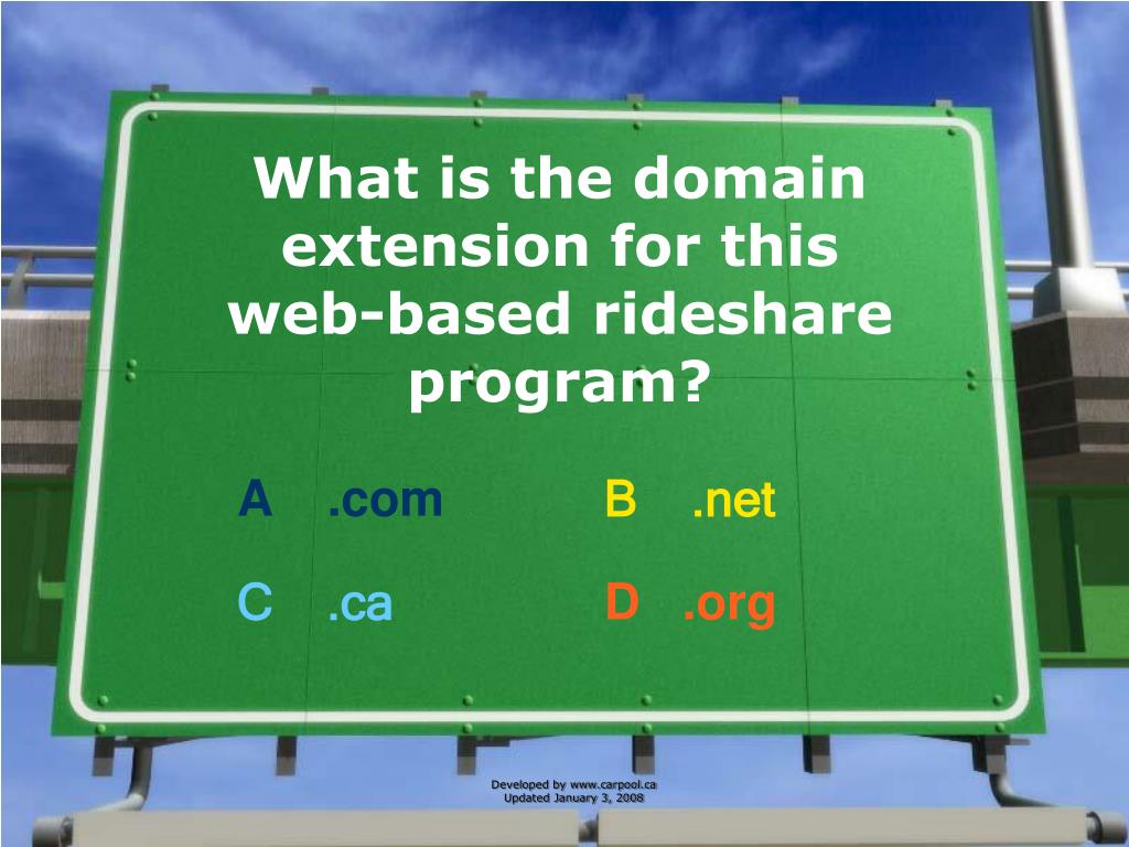 What is the domain extension for this web-based rideshare program? A .com B .net C .ca D .org Developed by www.carpool.ca Updated January 3, 2008