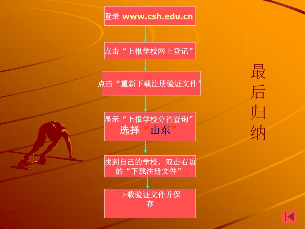 登录 www.csh.edu.cn 点击“上报学校网上登记” 最 后 归 纳 点击“重新下载注册验证文件” 显示“上报学校分省查询” 选择“山东” 找到自己的学校,双击右边 的“下载注册文件” 下载验证文件并保 存