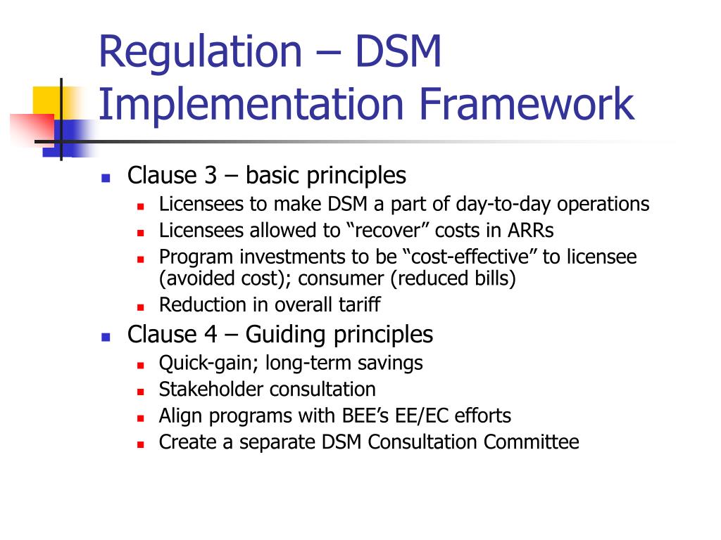 Regulation – DSM Implementation Framework • Clause 3 – basic principles • Licensees to make DSM a part of day-to-day operations • Licensees allowed to “recover” costs in ARRs • Program investments to be “cost-effective” to licensee (avoided cost); consumer (reduced bills) • Reduction in overall tariff • Clause 4 – Guiding principles • Quick-gain; long-term savings • Stakeholder consultation • Align programs with BEE’s EE/EC efforts • Create a separate DSM Consultation Committee
