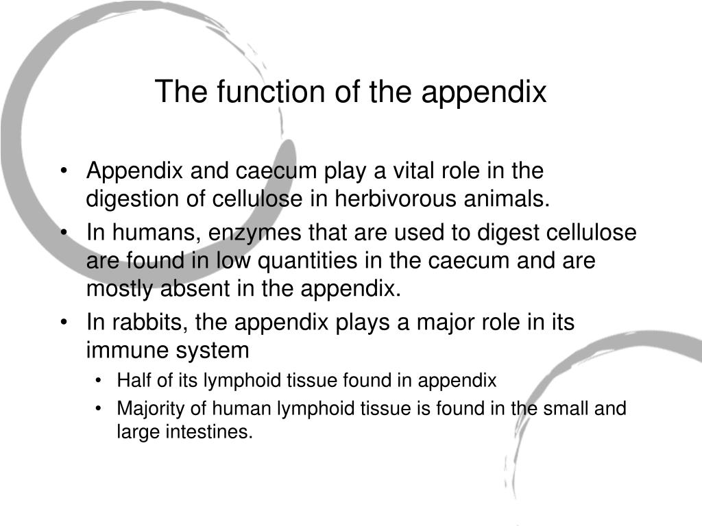 The function of the appendix • Appendix and caecum play a vital role in the digestion of cellulose in herbivorous animals. • In humans, enzymes that are used to digest cellulose are found in low quantities in the caecum and are mostly absent in the appendix. • In rabbits, the appendix plays a major role in its immune system • Half of its lymphoid tissue found in appendix • Majority of human lymphoid tissue is found in the small and large intestines.