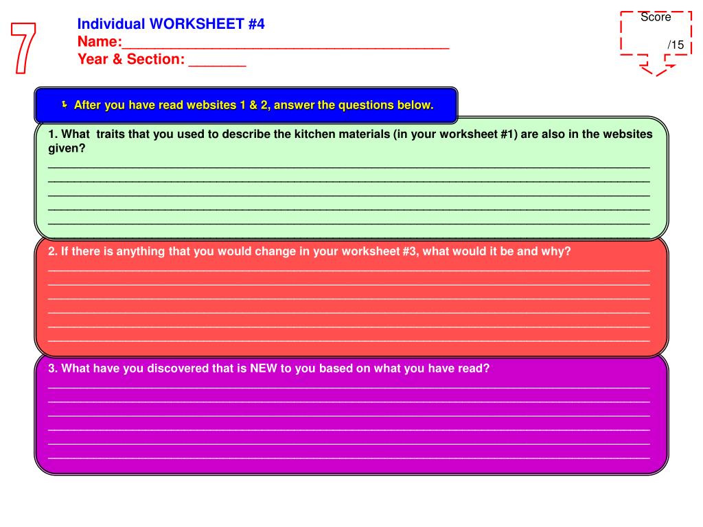 Score /15 7 Individual WORKSHEET #4Name:________________________________________ Year & Section: _______ After you have read websites 1 & 2, answer the questions below. 1. What traits that you used to describe the kitchen materials (in your worksheet #1) are also in the websites given? ______________________________________________________________________________________________________________________________________________________________________________________________________________________________________________________________________________________________________________________________________________________________________________________________________________________________________________________________________________________________________________________________________________________________________________ 2. If there is anything that you would change in your worksheet #3, what would it be and why? ______________________________________________________________________________________________________________________________________________________________________________________________________________________________________________________________________________________________________________________________________________________________________________________________________________________________________________________________________________________________________________________________________________________________________________ 3. What have you discovered that is NEW to you based on what you have read? ______________________________________________________________________________________________________________________________________________________________________________________________________________________________________________________________________________________________________________________________________________________________________________________________________________________________________________________________________________________________________________________________________________________________________________