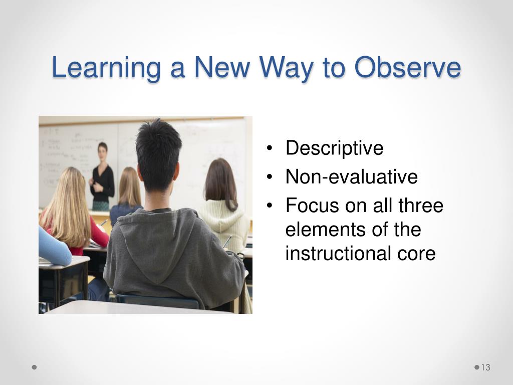 Descriptive Non-evaluative Focus on all three elements of the instructional core Learning a New Way to Observe