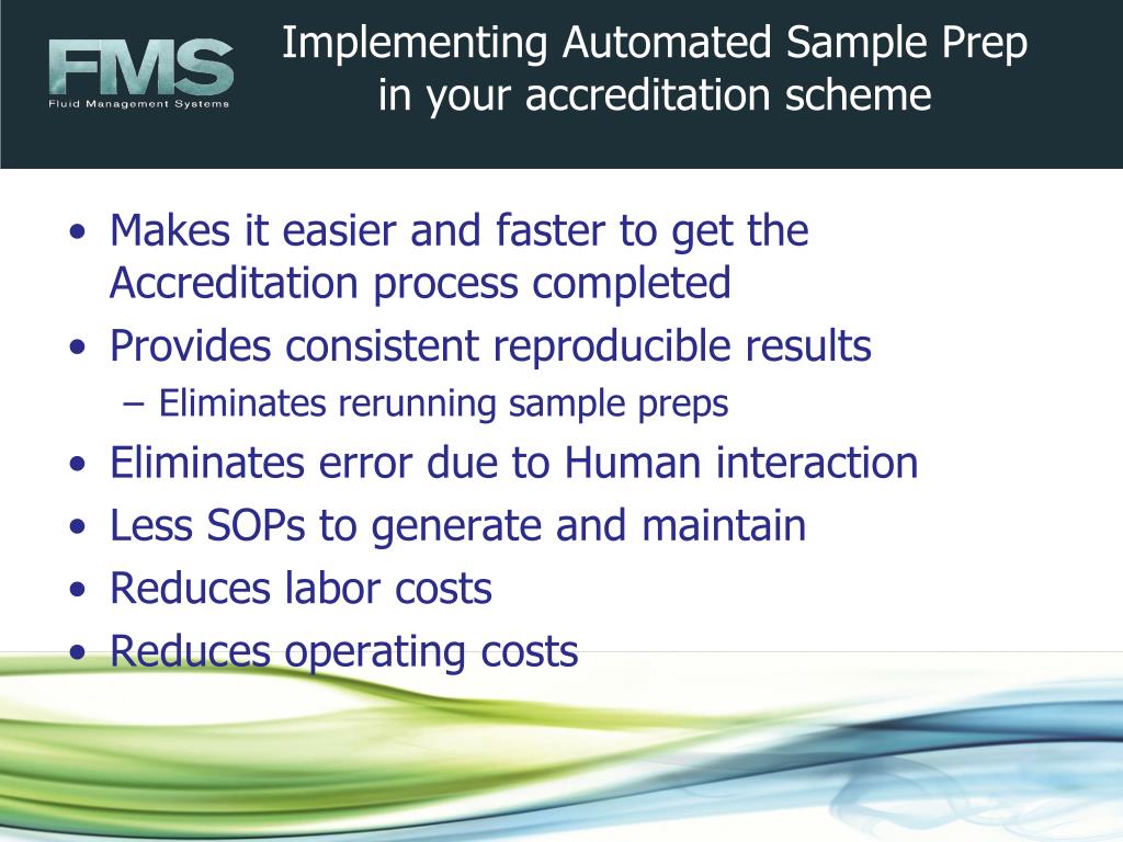 Implementing Automated Sample Prep in your accreditation scheme • Makes it easier and faster to get the Accreditation process completed • Provides consistent reproducible results • Eliminates rerunning sample preps • Eliminates error due to Human interaction • Less SOPs to generate and maintain • Reduces labor costs • Reduces operating costs