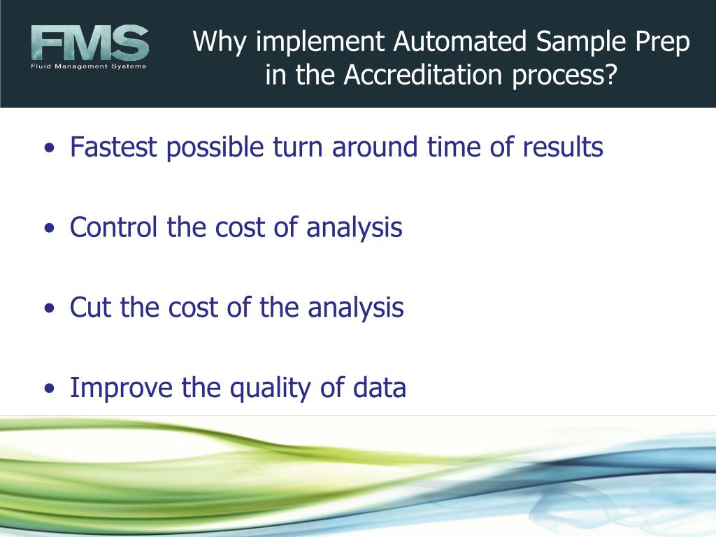 Why implement Automated Sample Prep in the Accreditation process? • Fastest possible turn around time of results • Control the cost of analysis • Cut the cost of the analysis • Improve the quality of data