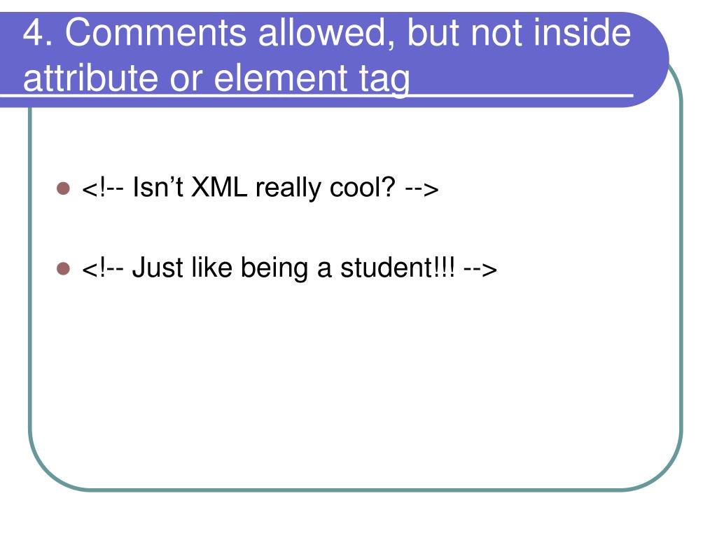 4. Comments allowed, but not inside attribute or element tag • <!-- Isn’t XML really cool? --> • <!-- Just like being a student!!! -->