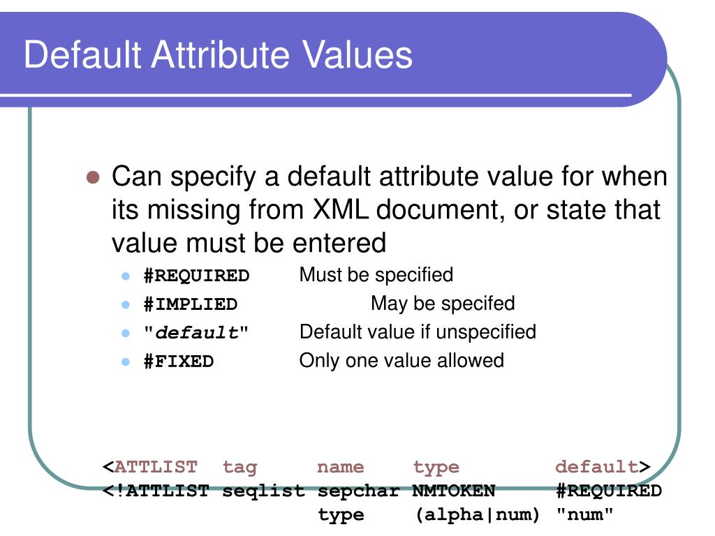 Default Attribute Values • Can specify a default attribute value for when its missing from XML document, or state that value must be entered • #REQUIRED Must be specified • #IMPLIED May be specifed • "default" Default value if unspecified • #FIXED Only one value allowed <ATTLIST tag name type default> <!ATTLIST seqlist sepchar NMTOKEN #REQUIRED type (alpha|num) "num"