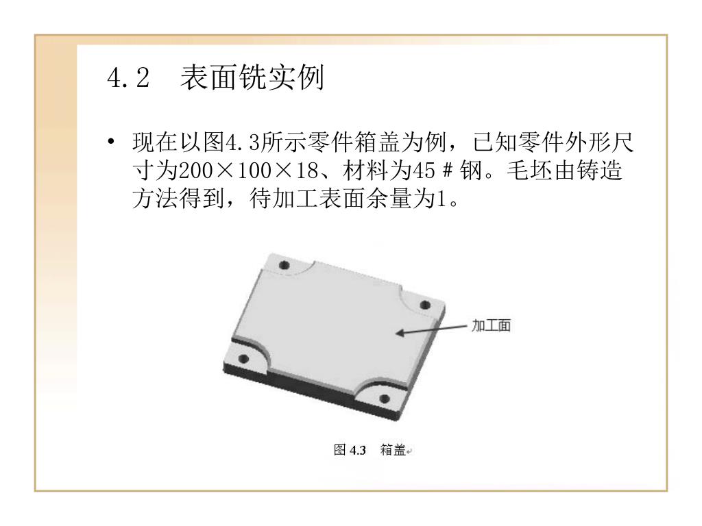 4.2 表面铣实例 • 现在以图4.3所示零件箱盖为例,已知零件外形尺寸为200×100×18、材料为45﹟钢。毛坯由铸造方法得到,待加工表面余量为1。