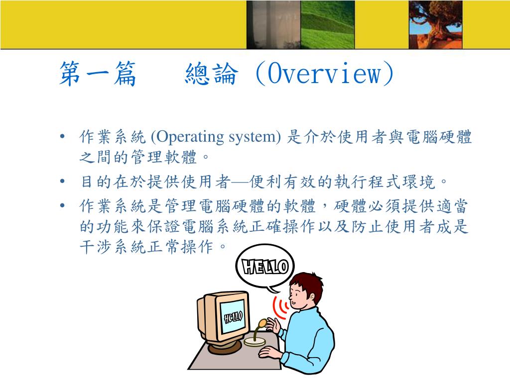 第一篇 總論 (Overview) • 作業系統 (Operating system) 是介於使用者與電腦硬體之間的管理軟體。 • 目的在於提供使用者—便利有效的執行程式環境。 • 作業系統是管理電腦硬體的軟體,硬體必須提供適當的功能來保證電腦系統正確操作以及防止使用者成是干涉系統正常操作。