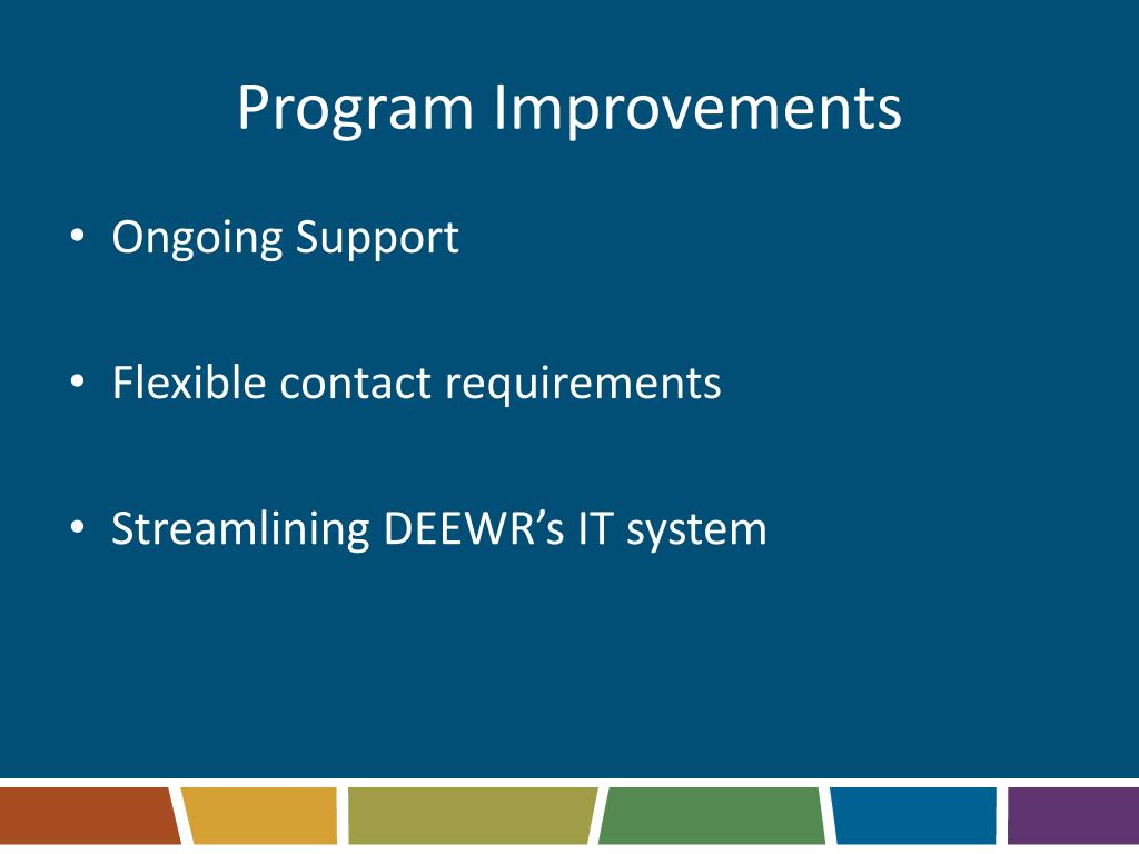 Program Improvements • Ongoing Support • Flexible contact requirements • Streamlining DEEWR’s IT system