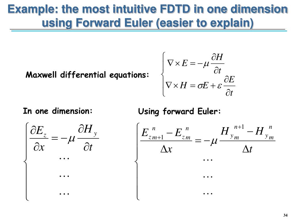 Example: the most intuitive FDTD in one dimension using Forward Euler (easier to explain) Maxwell differential equations: In one dimension: Using forward Euler: