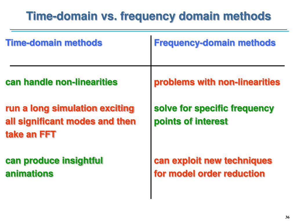 Time-domain vs. frequency domain methods Time-domain methodsFrequency-domain methods can handle non-linearitiesproblems with non-linearities run a long simulation excitingsolve for specific frequency all significant modes and thenpoints of interest take an FFT can produce insightfulcan exploit new techniques animationsfor model order reduction