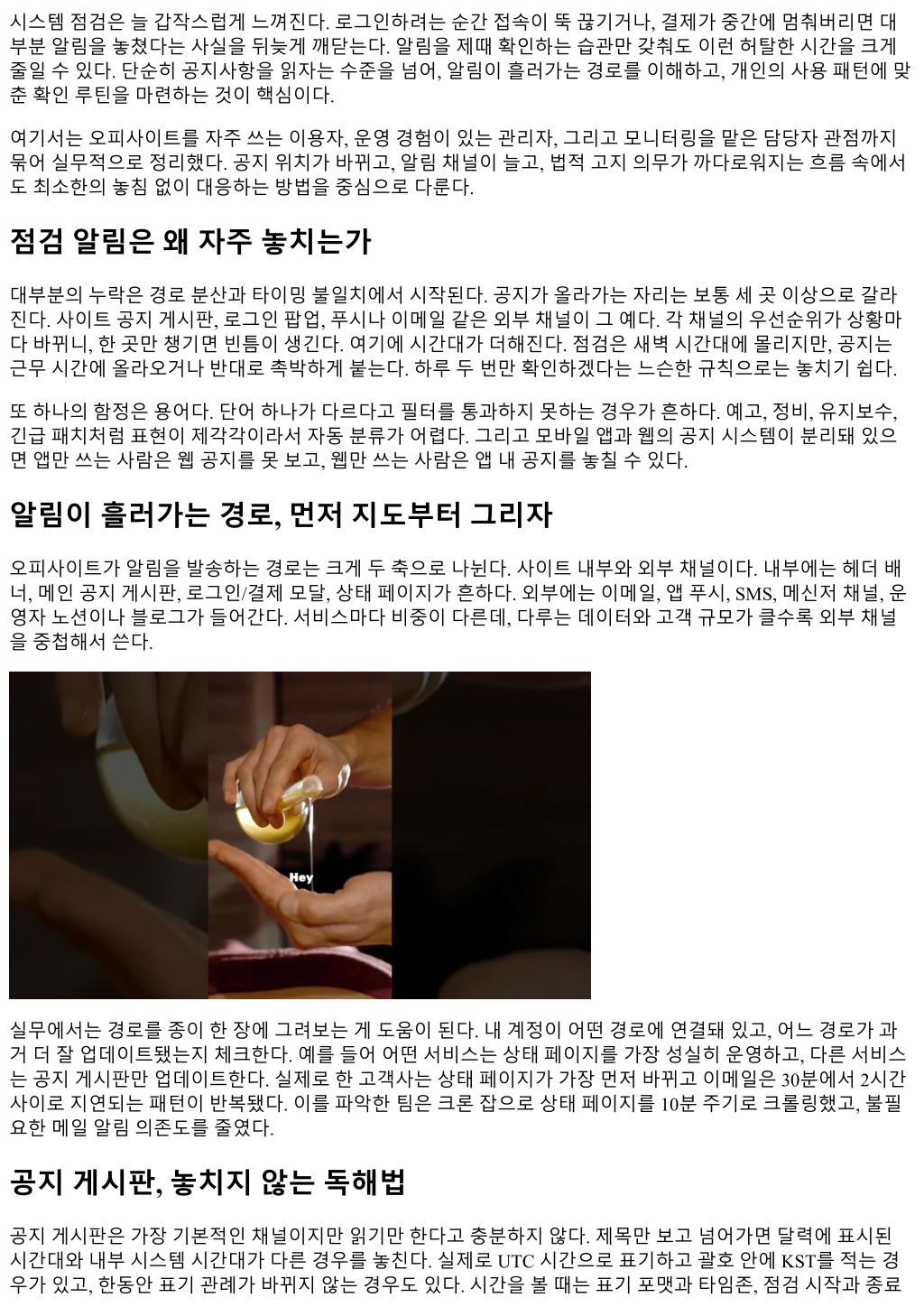 의예상과확정여부를분리해읽는다. 예상종료는범위로제시되는경우가많고, 실제종료는별도댓글이나후 속공지로나간다. 또하나의포인트는범위다. 전체시스템점검처럼보이지만, 세부를읽으면특정모듈만대상인경우가많다. 결 제모듈만영향을받는다면조회나알림은정상동작한다. 반대로인증서버점검이면대부분의기능이차단된 다. 공지본문에서영향범위를명확히구분해두면대응순서가달라진다. 팀에서업무연속성을유지해야한다 면, 기능별로임시플랜을미리적어두는습관이크게도움이된다. 로그인팝업과배너, 두번확인하는이유 로그인이나결제시점에뜨는팝업은주의를강제로끌지만, 접근성에한계가있다. 이미로그인상태라면팝업 을보지못하거나, 쿠키차단이나브라우저확장프로그램이팝업을막을수있다. 또모바일에서는화면크기때 문에세줄이상이잘리는경우가흔하다. 이런특성때문에팝업은요약알림이라고생각하고, 상세내용은게시 판이나상태페이지로재확인하는루틴이좋다. 배너도마찬가지다. 눈에띄지만쉽게무시된다. 배너색이바뀌는패턴을기억해두면최신도판단에도움이된 다. 초록은정상, 노랑은경고, 빨강은장애나점검같은식으로색상신호가일관된서비스가있다. 색상만으로 추정하지는말되, 색의의미를기억해두면스크롤을내리기전에주목도를확보할수있다. 상태페이지는가장먼저움직인다 정식공지가늦어지는경우에도상태페이지는비교적빠르게바뀌는편이다. API 응답속도, 오류율, 가동률지 표를시각화해두는서비스라면그래프변동이알림보다먼저올라온다. 여기서중요한건상태페이지의구독 기능이다. RSS, 이메일, 웹훅을제공하면팀도구와연결해자동으로알림을받는다. 실무에서가장안정적인방 법은상태페이지웹훅을사내메신저봇과연결해점검업데이트를흐름대로쌓는것이다. 사람이복사붙여넣 기할때생기는누락도줄어든다. 한가지주의할점은상태페이지가종종상위시스템을참조한다는사실이다. 예를들어결제게이트웨이와맵 API 같은외부의존성장애는오피사이트상태페이지에간접반영된다. 이경우오피사이트에서정상으로표기 되어도결제만안되는모순적상황이벌어질수있다. 그래서핵심외부의존성 2~3곳의상태페이지도함께구 독하면원인파악이한결빠르다. 이메일, 푸시, SMS의현실적인장단점 이메일은긴설명과링크를담기에좋다. 하지만수신함에파묻히기쉽다. 스팸필터와프로모션탭에밀려긴급 알림이몇시간뒤에보이는일이흔하다. 필터규칙을만들어제목에점검, 유지보수, 작업, 장애같은단어가들 어간메일을별도라벨로분류하고, 중요한발신도메인을화이트리스트에등록해두면체감강남오피누락률이 줄어든다. 다만제목표기관례가바뀌면필터가무용지물이되니분기마다규칙을점검하는습관이필요하다. 푸시는즉시성은좋지만너무잦으면무시된다. 앱설정에서공지를묶음처리하거나중요도를낮추는옵션이 있다면, 점검알림을상위중요도로설정하는것이요령이다. 스마트폰을바꾸거나 OS를업데이트할때권한이 초기화되는경우가있어서, 큰업데이트이후에는수동으로권한을한번확인해두자. SMS는가장강력한채널이지만비용이들고, 요약만전달한다. 실제로는링크클릭을유도하는용도로쓰인다. 이동중인상황이나야간비상대응에는 SMS가유효하지만, 평상시엔과도하다. 팀단위로는 SMS를장애단계 에서만쓰고, 계획점검은이메일과메신저로처리하는식으로역할을나누는편이효율적이다. 알림의형태를표준화해스스로해석가능하게만들기 알림은내용보다형식에서오해가생긴다. 시간범위, 영향범위, 작업목적, 복구기준, 후속보고의유무를일정 한순서로정리해두면읽는속도가빨라지고실수가줄어든다. 회사안에서정리템플릿을만들어두는것도방 법이다. 알림을받을때마다같은기준으로체크하고, 누락된항목이보이면담당채널에문의한다. 이렇게쌓은