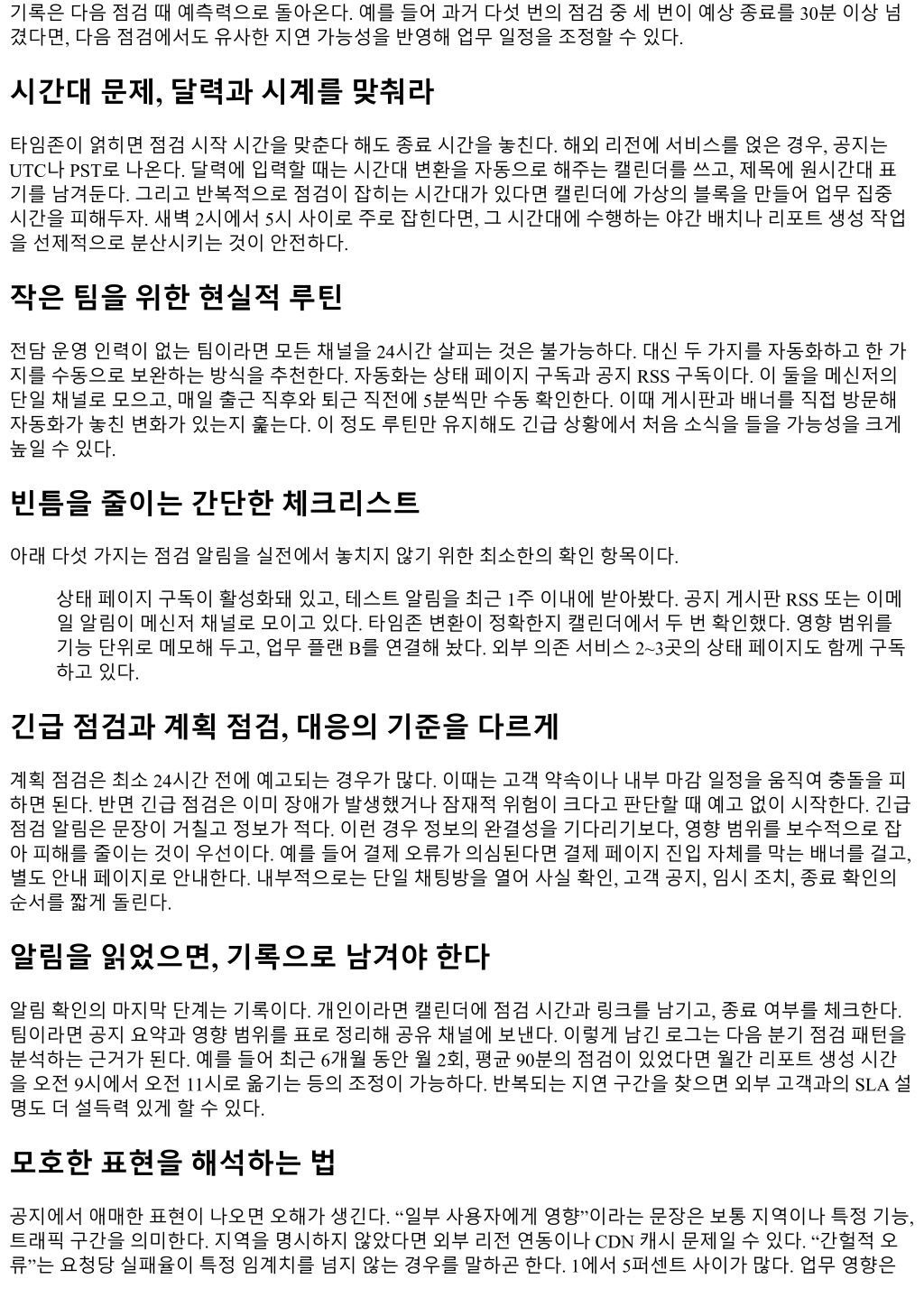 기록은다음점검때예측력으로돌아온다. 예를들어과거다섯번의점검중세번이예상종료를 30분이상넘 겼다면, 다음점검에서도유사한지연가능성을반영해업무일정을조정할수있다. 시간대문제, 달력과시계를맞춰라 타임존이얽히면점검시작시간을맞춘다해도종료시간을놓친다. 해외리전에서비스를얹은경우, 공지는 UTC나 PST로나온다. 달력에입력할때는시간대변환을자동으로해주는캘린더를쓰고, 제목에원시간대표 기를남겨둔다. 그리고반복적으로점검이잡히는시간대가있다면캘린더에가상의블록을만들어업무집중 시간을피해두자. 새벽 2시에서 5시사이로주로잡힌다면, 그시간대에수행하는야간배치나리포트생성작업 을선제적으로분산시키는것이안전하다. 작은팀을위한현실적루틴 전담운영인력이없는팀이라면모든채널을 24시간살피는것은불가능하다. 대신두가지를자동화하고한가 지를수동으로보완하는방식을추천한다. 자동화는상태페이지구독과공지 RSS 구독이다. 이둘을메신저의 단일채널로모으고, 매일출근직후와퇴근직전에 5분씩만수동확인한다. 이때게시판과배너를직접방문해 자동화가놓친변화가있는지훑는다. 이정도루틴만유지해도긴급상황에서처음소식을들을가능성을크게 높일수있다. 빈틈을줄이는간단한체크리스트 아래다섯가지는점검알림을실전에서놓치지않기위한최소한의확인항목이다. 상태페이지구독이활성화돼있고, 테스트알림을최근 1주이내에받아봤다. 공지게시판 RSS 또는이메 일알림이메신저채널로모이고있다. 타임존변환이정확한지캘린더에서두번확인했다. 영향범위를 기능단위로메모해두고, 업무플랜 B를연결해놨다. 외부의존서비스 2~3곳의상태페이지도함께구독 하고있다. 긴급점검과계획점검, 대응의기준을다르게 계획점검은최소 24시간전에예고되는경우가많다. 이때는고객약속이나내부마감일정을움직여충돌을피 하면된다. 반면긴급점검은이미장애가발생했거나잠재적위험이크다고판단할때예고없이시작한다. 긴급 점검알림은문장이거칠고정보가적다. 이런경우정보의완결성을기다리기보다, 영향범위를보수적으로잡 아피해를줄이는것이우선이다. 예를들어결제오류가의심된다면결제페이지진입자체를막는배너를걸고, 별도안내페이지로안내한다. 내부적으로는단일채팅방을열어사실확인, 고객공지, 임시조치, 종료확인의 순서를짧게돌린다. 알림을읽었으면, 기록으로남겨야한다 알림확인의마지막단계는기록이다. 개인이라면캘린더에점검시간과링크를남기고, 종료여부를체크한다. 팀이라면공지요약과영향범위를표로정리해공유채널에보낸다. 이렇게남긴로그는다음분기점검패턴을 분석하는근거가된다. 예를들어최근 6개월동안월 2회, 평균 90분의점검이있었다면월간리포트생성시간 을오전 9시에서오전 11시로옮기는등의조정이가능하다. 반복되는지연구간을찾으면외부고객과의 SLA 설 명도더설득력있게할수있다. 모호한표현을해석하는법 공지에서애매한표현이나오면오해가생긴다. “일부사용자에게영향”이라는문장은보통지역이나특정기능, 트래픽구간을의미한다. 지역을명시하지않았다면외부리전연동이나 CDN 캐시문제일수있다. “간헐적오 류”는요청당실패율이특정임계치를넘지않는경우를말하곤한다. 1에서 5퍼센트사이가많다. 업무영향은