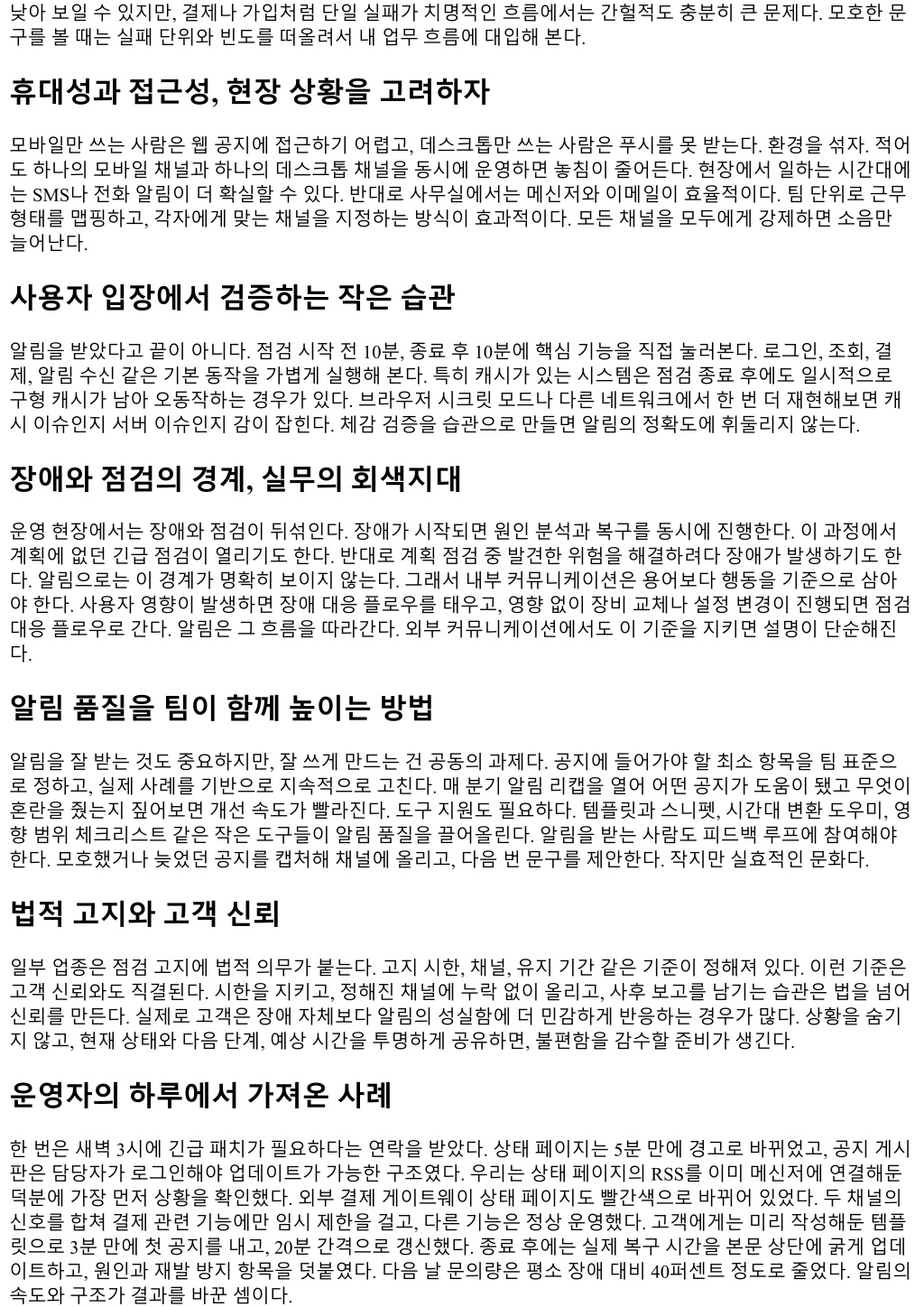낮아보일수있지만, 결제나가입처럼단일실패가치명적인흐름에서는간헐적도충분히큰문제다. 모호한문 구를볼때는실패단위와빈도를떠올려서내업무흐름에대입해본다. 휴대성과접근성, 현장상황을고려하자 모바일만쓰는사람은웹공지에접근하기어렵고, 데스크톱만쓰는사람은푸시를못받는다. 환경을섞자. 적어 도하나의모바일채널과하나의데스크톱채널을동시에운영하면놓침이줄어든다. 현장에서일하는시간대에 는 SMS나전화알림이더확실할수있다. 반대로사무실에서는메신저와이메일이효율적이다. 팀단위로근무 형태를맵핑하고, 각자에게맞는채널을지정하는방식이효과적이다. 모든채널을모두에게강제하면소음만 늘어난다. 사용자입장에서검증하는작은습관 알림을받았다고끝이아니다. 점검시작전 10분, 종료후 10분에핵심기능을직접눌러본다. 로그인, 조회, 결 제, 알림수신같은기본동작을가볍게실행해본다. 특히캐시가있는시스템은점검종료후에도일시적으로 구형캐시가남아오동작하는경우가있다. 브라우저시크릿모드나다른네트워크에서한번더재현해보면캐 시이슈인지서버이슈인지감이잡힌다. 체감검증을습관으로만들면알림의정확도에휘둘리지않는다. 장애와점검의경계, 실무의회색지대 운영현장에서는장애와점검이뒤섞인다. 장애가시작되면원인분석과복구를동시에진행한다. 이과정에서 계획에없던긴급점검이열리기도한다. 반대로계획점검중발견한위험을해결하려다장애가발생하기도한 다. 알림으로는이경계가명확히보이지않는다. 그래서내부커뮤니케이션은용어보다행동을기준으로삼아 야한다. 사용자영향이발생하면장애대응플로우를태우고, 영향없이장비교체나설정변경이진행되면점검 대응플로우로간다. 알림은그흐름을따라간다. 외부커뮤니케이션에서도이기준을지키면설명이단순해진 다. 알림품질을팀이함께높이는방법 알림을잘받는것도중요하지만, 잘쓰게만드는건공동의과제다. 공지에들어가야할최소항목을팀표준으 로정하고, 실제사례를기반으로지속적으로고친다. 매분기알림리캡을열어어떤공지가도움이됐고무엇이 혼란을줬는지짚어보면개선속도가빨라진다. 도구지원도필요하다. 템플릿과스니펫, 시간대변환도우미, 영 향범위체크리스트같은작은도구들이알림품질을끌어올린다. 알림을받는사람도피드백루프에참여해야 한다. 모호했거나늦었던공지를캡처해채널에올리고, 다음번문구를제안한다. 작지만실효적인문화다. 법적고지와고객신뢰 일부업종은점검고지에법적의무가붙는다. 고지시한, 채널, 유지기간같은기준이정해져있다. 이런기준은 고객신뢰와도직결된다. 시한을지키고, 정해진채널에누락없이올리고, 사후보고를남기는습관은법을넘어 신뢰를만든다. 실제로고객은장애자체보다알림의성실함에더민감하게반응하는경우가많다. 상황을숨기 지않고, 현재상태와다음단계, 예상시간을투명하게공유하면, 불편함을감수할준비가생긴다. 운영자의하루에서가져온사례 한번은새벽 3시에긴급패치가필요하다는연락을받았다. 상태페이지는 5분만에경고로바뀌었고, 공지게시 판은담당자가로그인해야업데이트가가능한구조였다. 우리는상태페이지의 RSS를이미메신저에연결해둔 덕분에가장먼저상황을확인했다. 외부결제게이트웨이상태페이지도빨간색으로바뀌어있었다. 두채널의 신호를합쳐결제관련기능에만임시제한을걸고, 다른기능은정상운영했다. 고객에게는미리작성해둔템플 릿으로 3분만에첫공지를내고, 20분간격으로갱신했다. 종료후에는실제복구시간을본문상단에굵게업데 이트하고, 원인과재발방지항목을덧붙였다. 다음날문의량은평소장애대비 40퍼센트정도로줄었다. 알림의 속도와구조가결과를바꾼셈이다.