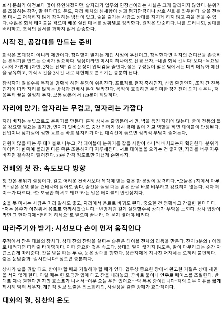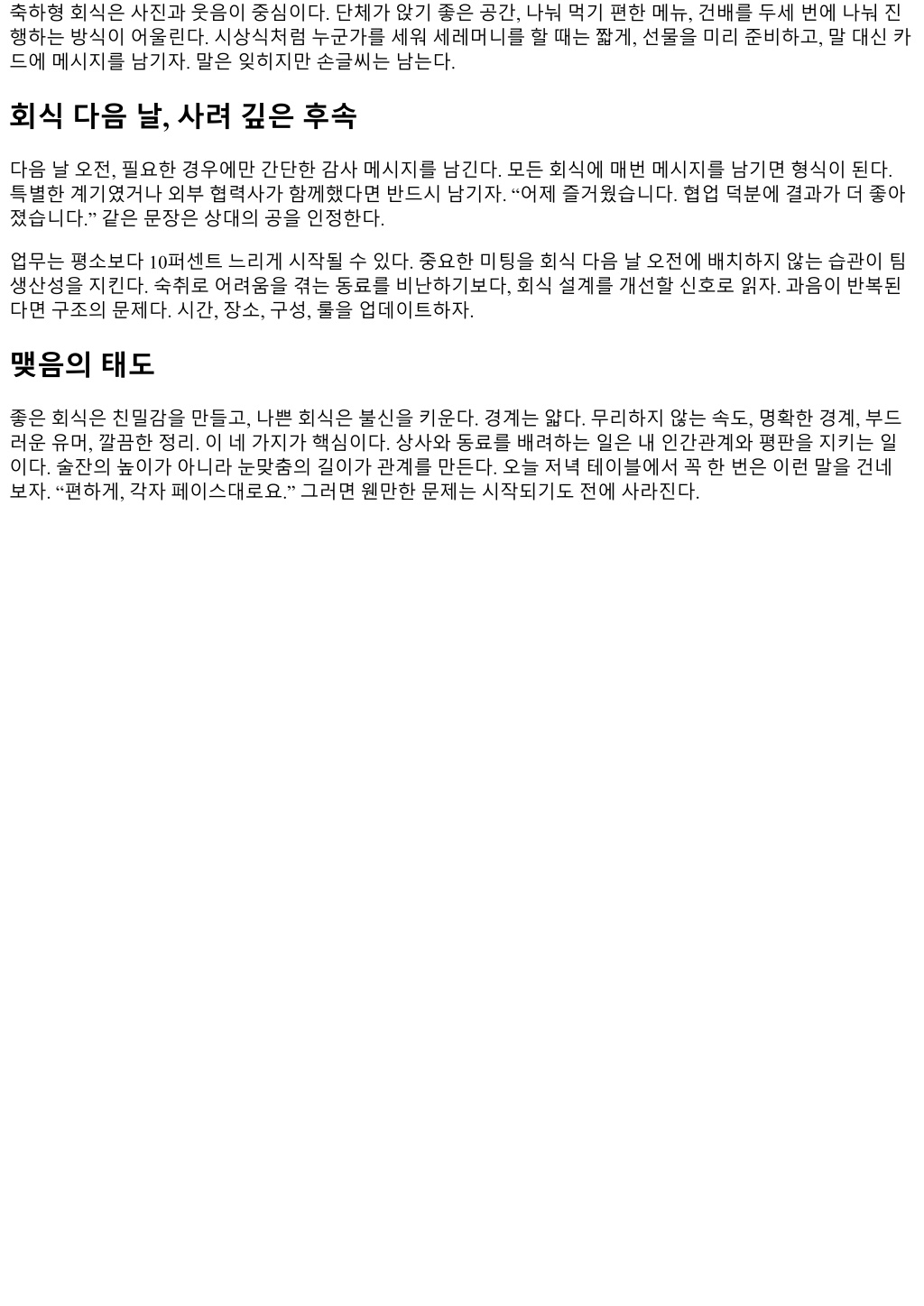 축하형회식은사진과웃음이중심이다. 단체가앉기좋은공간, 나눠먹기편한메뉴, 건배를두세번에나눠진 행하는방식이어울린다. 시상식처럼누군가를세워세레머니를할때는짧게, 선물을미리준비하고, 말대신카 드에메시지를남기자. 말은잊히지만손글씨는남는다. 회식다음날, 사려깊은후속 다음날오전, 필요한경우에만간단한감사메시지를남긴다. 모든회식에매번메시지를남기면형식이된다. 특별한계기였거나외부협력사가함께했다면반드시남기자. “어제즐거웠습니다. 협업덕분에결과가더좋아 졌습니다.” 같은문장은상대의공을인정한다. 업무는평소보다 10퍼센트느리게시작될수있다. 중요한미팅을회식다음날오전에배치하지않는습관이팀 생산성을지킨다. 숙취로어려움을겪는동료를비난하기보다, 회식설계를개선할신호로읽자. 과음이반복된 다면구조의문제다. 시간, 장소, 구성, 룰을업데이트하자. 맺음의태도 좋은회식은친밀감을만들고, 나쁜회식은불신을키운다. 경계는얇다. 무리하지않는속도, 명확한경계, 부드 러운유머, 깔끔한정리. 이네가지가핵심이다. 상사와동료를배려하는일은내인간관계와평판을지키는일 이다. 술잔의높이가아니라눈맞춤의길이가관계를만든다. 오늘저녁테이블에서꼭한번은이런말을건네 보자. “편하게, 각자페이스대로요.” 그러면웬만한문제는시작되기도전에사라진다.