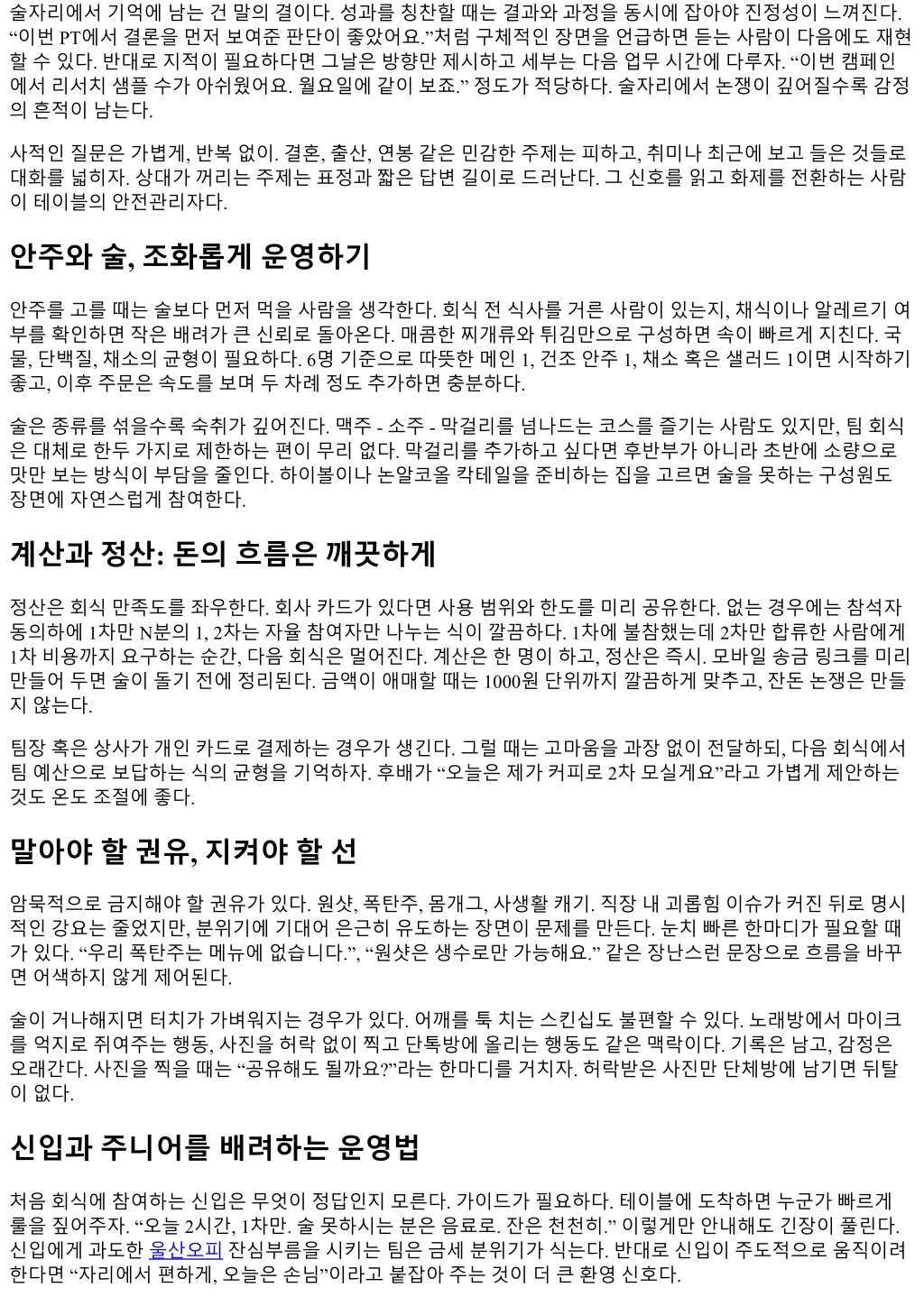 술자리에서기억에남는건말의결이다. 성과를칭찬할때는결과와과정을동시에잡아야진정성이느껴진다. “이번 PT에서결론을먼저보여준판단이좋았어요.”처럼구체적인장면을언급하면듣는사람이다음에도재현 할수있다. 반대로지적이필요하다면그날은방향만제시하고세부는다음업무시간에다루자. “이번캠페인 에서리서치샘플수가아쉬웠어요. 월요일에같이보죠.” 정도가적당하다. 술자리에서논쟁이깊어질수록감정 의흔적이남는다. 사적인질문은가볍게, 반복없이. 결혼, 출산, 연봉같은민감한주제는피하고, 취미나최근에보고들은것들로 대화를넓히자. 상대가꺼리는주제는표정과짧은답변길이로드러난다. 그신호를읽고화제를전환하는사람 이테이블의안전관리자다. 안주와술, 조화롭게운영하기 안주를고를때는술보다먼저먹을사람을생각한다. 회식전식사를거른사람이있는지, 채식이나알레르기여 부를확인하면작은배려가큰신뢰로돌아온다. 매콤한찌개류와튀김만으로구성하면속이빠르게지친다. 국 물, 단백질, 채소의균형이필요하다. 6명기준으로따뜻한메인 1, 건조안주 1, 채소혹은샐러드 1이면시작하기 좋고, 이후주문은속도를보며두차례정도추가하면충분하다. 술은종류를섞을수록숙취가깊어진다. 맥주 - 소주 - 막걸리를넘나드는코스를즐기는사람도있지만, 팀회식 은대체로한두가지로제한하는편이무리없다. 막걸리를추가하고싶다면후반부가아니라초반에소량으로 맛만보는방식이부담을줄인다. 하이볼이나논알코올칵테일을준비하는집을고르면술을못하는구성원도 장면에자연스럽게참여한다. 계산과정산: 돈의흐름은깨끗하게 정산은회식만족도를좌우한다. 회사카드가있다면사용범위와한도를미리공유한다. 없는경우에는참석자 동의하에 1차만 N분의 1, 2차는자율참여자만나누는식이깔끔하다. 1차에불참했는데 2차만합류한사람에게 1차비용까지요구하는순간, 다음회식은멀어진다. 계산은한명이하고, 정산은즉시. 모바일송금링크를미리 만들어두면술이돌기전에정리된다. 금액이애매할때는 1000원단위까지깔끔하게맞추고, 잔돈논쟁은만들 지않는다. 팀장혹은상사가개인카드로결제하는경우가생긴다. 그럴때는고마움을과장없이전달하되, 다음회식에서 팀예산으로보답하는식의균형을기억하자. 후배가 “오늘은제가커피로 2차모실게요”라고가볍게제안하는 것도온도조절에좋다. 말아야할권유, 지켜야할선 암묵적으로금지해야할권유가있다. 원샷, 폭탄주, 몸개그, 사생활캐기. 직장내괴롭힘이슈가커진뒤로명시 적인강요는줄었지만, 분위기에기대어은근히유도하는장면이문제를만든다. 눈치빠른한마디가필요할때 가있다. “우리폭탄주는메뉴에없습니다.”, “원샷은생수로만가능해요.” 같은장난스런문장으로흐름을바꾸 면어색하지않게제어된다. 술이거나해지면터치가가벼워지는경우가있다. 어깨를툭치는스킨십도불편할수있다. 노래방에서마이크 를억지로쥐여주는행동, 사진을허락없이찍고단톡방에올리는행동도같은맥락이다. 기록은남고, 감정은 오래간다. 사진을찍을때는 “공유해도될까요?”라는한마디를거치자. 허락받은사진만단체방에남기면뒤탈 이없다. 신입과주니어를배려하는운영법 처음회식에참여하는신입은무엇이정답인지모른다. 가이드가필요하다. 테이블에도착하면누군가빠르게 룰을짚어주자. “오늘 2시간, 1차만. 술못하시는분은음료로. 잔은천천히.” 이렇게만안내해도긴장이풀린다. 신입에게과도한울산오피잔심부름을시키는팀은금세분위기가식는다. 반대로신입이주도적으로움직이려 한다면 “자리에서편하게, 오늘은손님”이라고붙잡아주는것이더큰환영신호다.