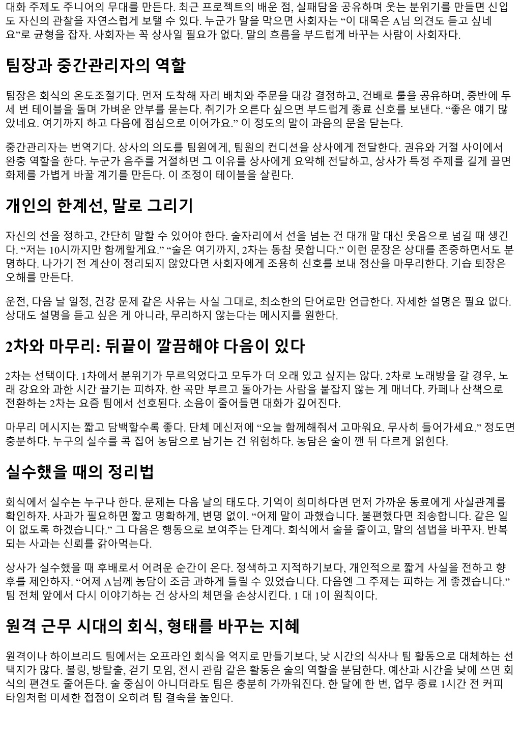 대화주제도주니어의무대를만든다. 최근프로젝트의배운점, 실패담을공유하며웃는분위기를만들면신입 도자신의관찰을자연스럽게보탤수있다. 누군가말을막으면사회자는 “이대목은 A님의견도듣고싶네 요”로균형을잡자. 사회자는꼭상사일필요가없다. 말의흐름을부드럽게바꾸는사람이사회자다. 팀장과중간관리자의역할 팀장은회식의온도조절기다. 먼저도착해자리배치와주문을대강결정하고, 건배로룰을공유하며, 중반에두 세번테이블을돌며가벼운안부를묻는다. 취기가오른다싶으면부드럽게종료신호를보낸다. “좋은얘기많 았네요. 여기까지하고다음에점심으로이어가요.” 이정도의말이과음의문을닫는다. 중간관리자는번역기다. 상사의의도를팀원에게, 팀원의컨디션을상사에게전달한다. 권유와거절사이에서 완충역할을한다. 누군가음주를거절하면그이유를상사에게요약해전달하고, 상사가특정주제를길게끌면 화제를가볍게바꿀계기를만든다. 이조정이테이블을살린다. 개인의한계선, 말로그리기 자신의선을정하고, 간단히말할수있어야한다. 술자리에서선을넘는건대개말대신웃음으로넘길때생긴 다. “저는 10시까지만함께할게요.” “술은여기까지, 2차는동참못합니다.” 이런문장은상대를존중하면서도분 명하다. 나가기전계산이정리되지않았다면사회자에게조용히신호를보내정산을마무리한다. 기습퇴장은 오해를만든다. 운전, 다음날일정, 건강문제같은사유는사실그대로, 최소한의단어로만언급한다. 자세한설명은필요없다. 상대도설명을듣고싶은게아니라, 무리하지않는다는메시지를원한다. 2차와마무리: 뒤끝이깔끔해야다음이있다 2차는선택이다. 1차에서분위기가무르익었다고모두가더오래있고싶지는않다. 2차로노래방을갈경우, 노 래강요와과한시간끌기는피하자. 한곡만부르고돌아가는사람을붙잡지않는게매너다. 카페나산책으로 전환하는 2차는요즘팀에서선호된다. 소음이줄어들면대화가깊어진다. 마무리메시지는짧고담백할수록좋다. 단체메신저에 “오늘함께해줘서고마워요. 무사히들어가세요.” 정도면 충분하다. 누구의실수를콕집어농담으로남기는건위험하다. 농담은술이깬뒤다르게읽힌다. 실수했을때의정리법 회식에서실수는누구나한다. 문제는다음날의태도다. 기억이희미하다면먼저가까운동료에게사실관계를 확인하자. 사과가필요하면짧고명확하게, 변명없이. “어제말이과했습니다. 불편했다면죄송합니다. 같은일 이없도록하겠습니다.” 그다음은행동으로보여주는단계다. 회식에서술을줄이고, 말의셈법을바꾸자. 반복 되는사과는신뢰를갉아먹는다. 상사가실수했을때후배로서어려운순간이온다. 정색하고지적하기보다, 개인적으로짧게사실을전하고향 후를제안하자. “어제 A님께농담이조금과하게들릴수있었습니다. 다음엔그주제는피하는게좋겠습니다.” 팀전체앞에서다시이야기하는건상사의체면을손상시킨다. 1 대 1이원칙이다. 원격근무시대의회식, 형태를바꾸는지혜 원격이나하이브리드팀에서는오프라인회식을억지로만들기보다, 낮시간의식사나팀활동으로대체하는선 택지가많다. 볼링, 방탈출, 걷기모임, 전시관람같은활동은술의역할을분담한다. 예산과시간을낮에쓰면회 식의편견도줄어든다. 술중심이아니더라도팀은충분히가까워진다. 한달에한번, 업무종료 1시간전커피 타임처럼미세한접점이오히려팀결속을높인다.