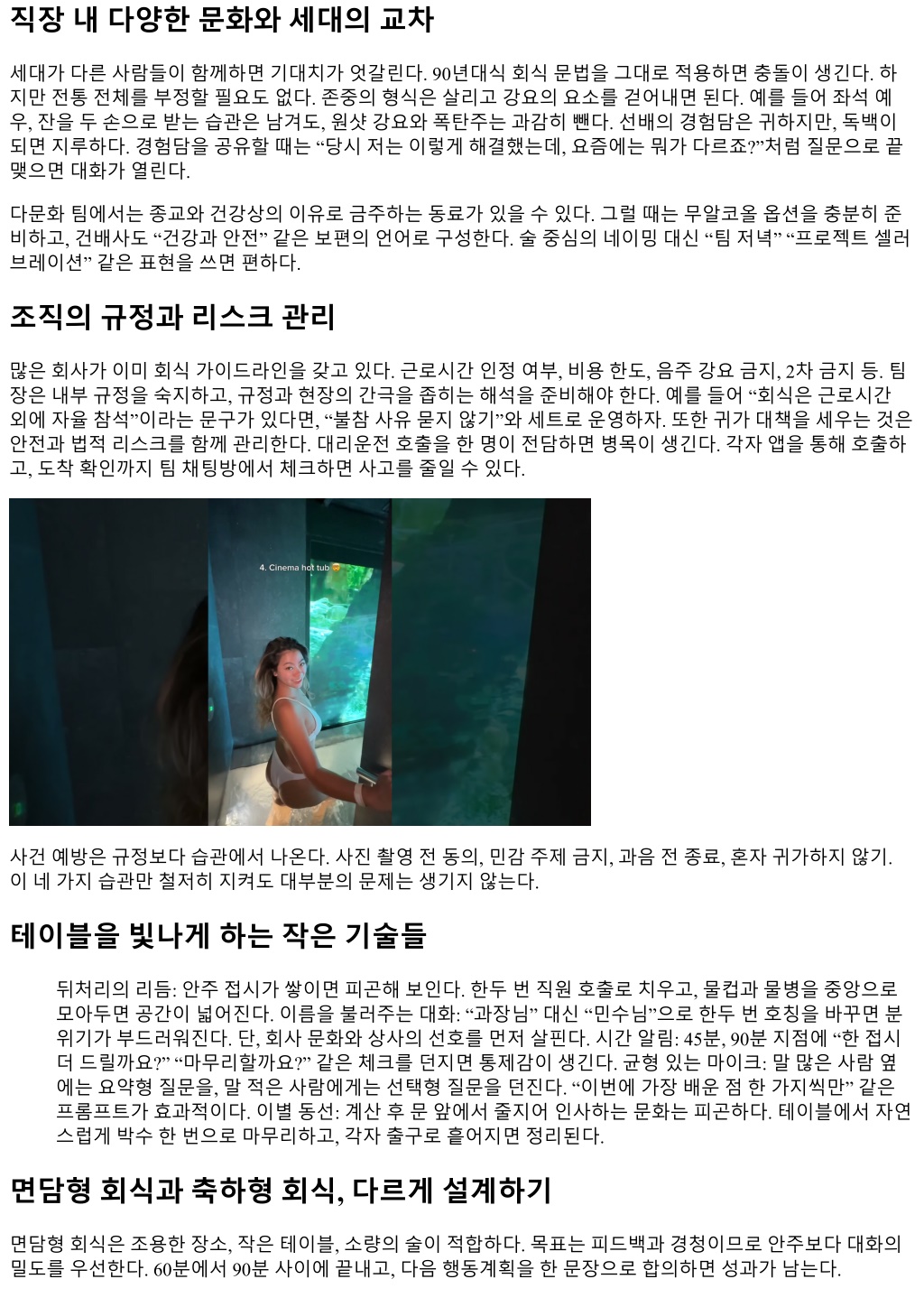 직장내다양한문화와세대의교차 세대가다른사람들이함께하면기대치가엇갈린다. 90년대식회식문법을그대로적용하면충돌이생긴다. 하 지만전통전체를부정할필요도없다. 존중의형식은살리고강요의요소를걷어내면된다. 예를들어좌석예 우, 잔을두손으로받는습관은남겨도, 원샷강요와폭탄주는과감히뺀다. 선배의경험담은귀하지만, 독백이 되면지루하다. 경험담을공유할때는 “당시저는이렇게해결했는데, 요즘에는뭐가다르죠?”처럼질문으로끝 맺으면대화가열린다. 다문화팀에서는종교와건강상의이유로금주하는동료가있을수있다. 그럴때는무알코올옵션을충분히준 비하고, 건배사도 “건강과안전” 같은보편의언어로구성한다. 술중심의네이밍대신 “팀저녁” “프로젝트셀러 브레이션” 같은표현을쓰면편하다. 조직의규정과리스크관리 많은회사가이미회식가이드라인을갖고있다. 근로시간인정여부, 비용한도, 음주강요금지, 2차금지등. 팀 장은내부규정을숙지하고, 규정과현장의간극을좁히는해석을준비해야한다. 예를들어 “회식은근로시간 외에자율참석”이라는문구가있다면, “불참사유묻지않기”와세트로운영하자. 또한귀가대책을세우는것은 안전과법적리스크를함께관리한다. 대리운전호출을한명이전담하면병목이생긴다. 각자앱을통해호출하 고, 도착확인까지팀채팅방에서체크하면사고를줄일수있다. 사건예방은규정보다습관에서나온다. 사진촬영전동의, 민감주제금지, 과음전종료, 혼자귀가하지않기. 이네가지습관만철저히지켜도대부분의문제는생기지않는다. 테이블을빛나게하는작은기술들 뒤처리의리듬: 안주접시가쌓이면피곤해보인다. 한두번직원호출로치우고, 물컵과물병을중앙으로 모아두면공간이넓어진다. 이름을불러주는대화: “과장님” 대신 “민수님”으로한두번호칭을바꾸면분 위기가부드러워진다. 단, 회사문화와상사의선호를먼저살핀다. 시간알림: 45분, 90분지점에 “한접시 더드릴까요?” “마무리할까요?” 같은체크를던지면통제감이생긴다. 균형있는마이크: 말많은사람옆 에는요약형질문을, 말적은사람에게는선택형질문을던진다. “이번에가장배운점한가지씩만” 같은 프롬프트가효과적이다. 이별동선: 계산후문앞에서줄지어인사하는문화는피곤하다. 테이블에서자연 스럽게박수한번으로마무리하고, 각자출구로흩어지면정리된다. 면담형회식과축하형회식, 다르게설계하기 면담형회식은조용한장소, 작은테이블, 소량의술이적합하다. 목표는피드백과경청이므로안주보다대화의 밀도를우선한다. 60분에서 90분사이에끝내고, 다음행동계획을한문장으로합의하면성과가남는다.