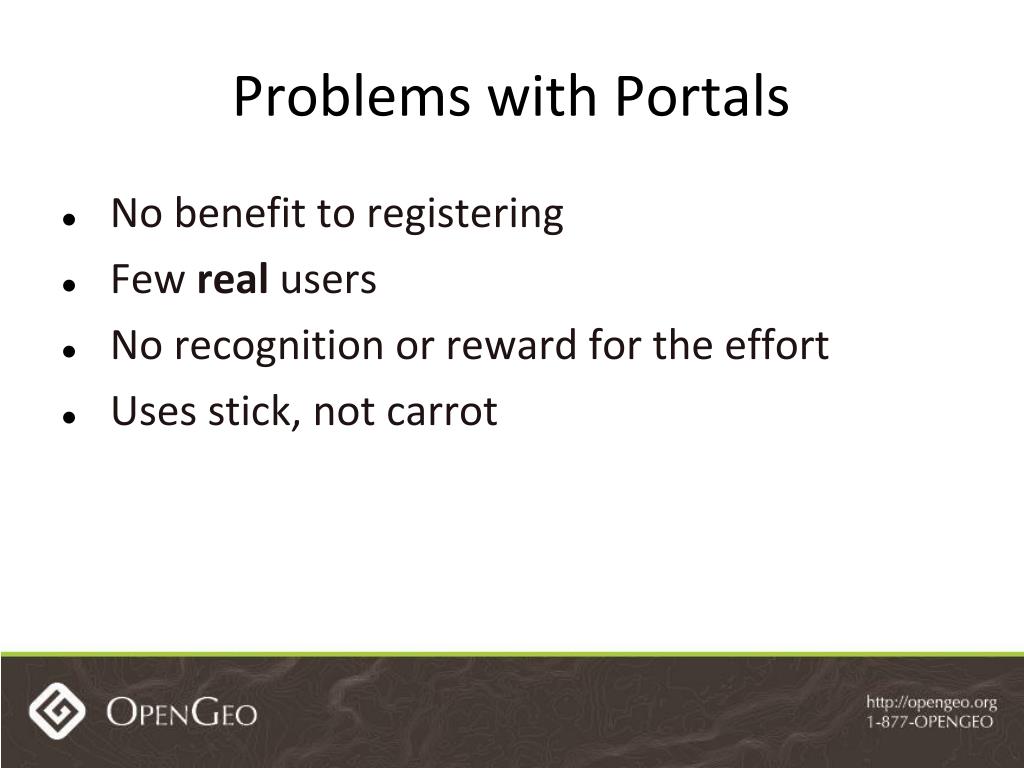Problems with Portals No benefit to registering Few real users No recognition or reward for the effort Uses stick, not carrot