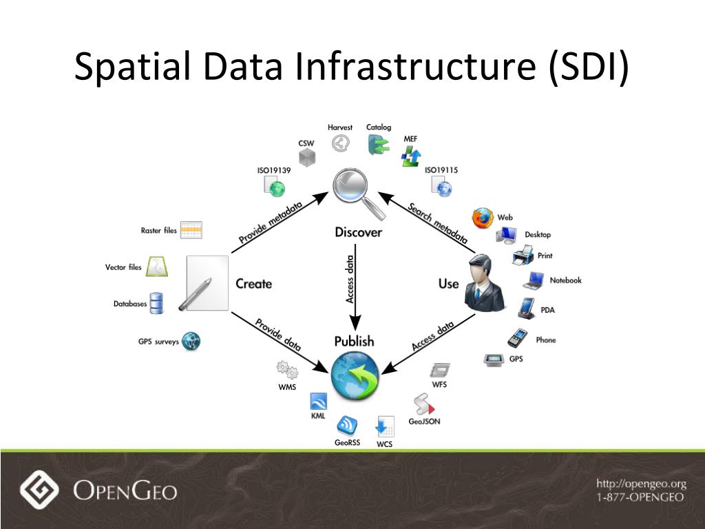 “[Spatial Data Infrastructure] provides a basis for spatial data discovery, evaluation, and application for users and providers within all levels of government, the commercial sector, the non-profit sector, academia and by citizens in general.” – SDI Cookbook Spatial Data Infrastructure (SDI)