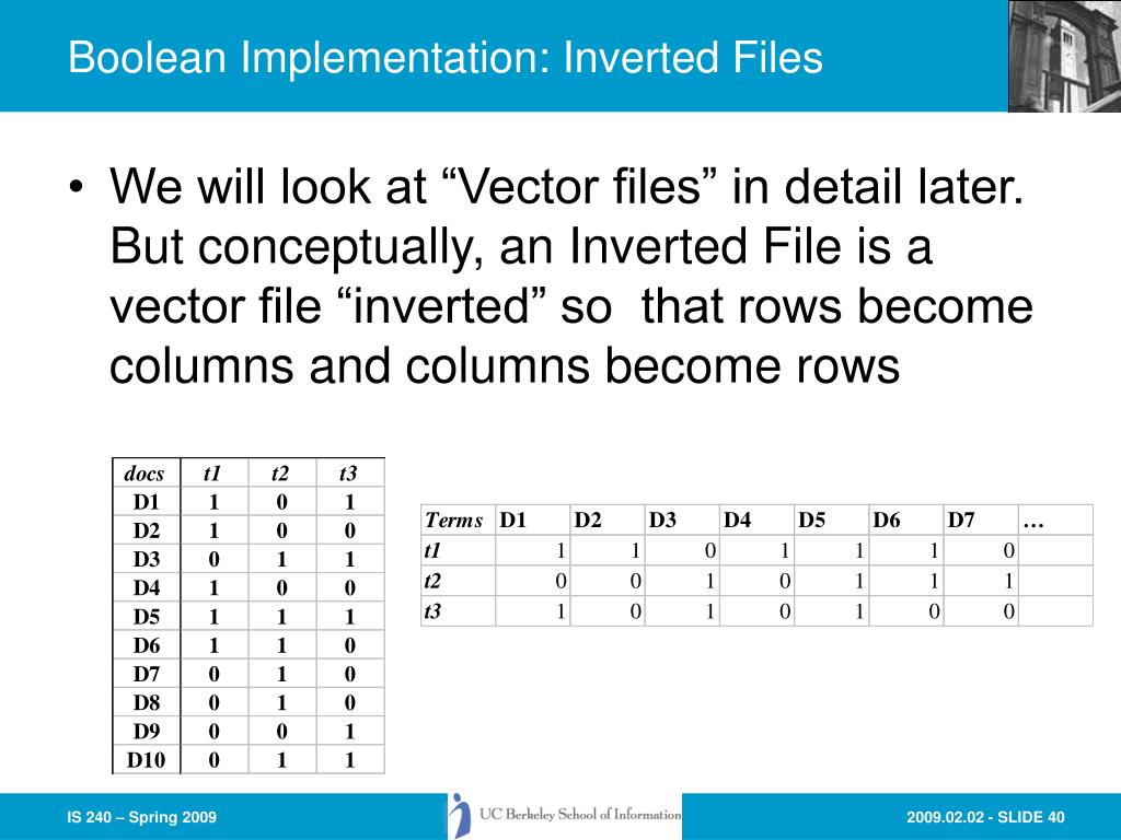 Boolean Implementation: Inverted Files • We will look at “Vector files” in detail later. But conceptually, an Inverted File is a vector file “inverted” so that rows become columns and columns become rows