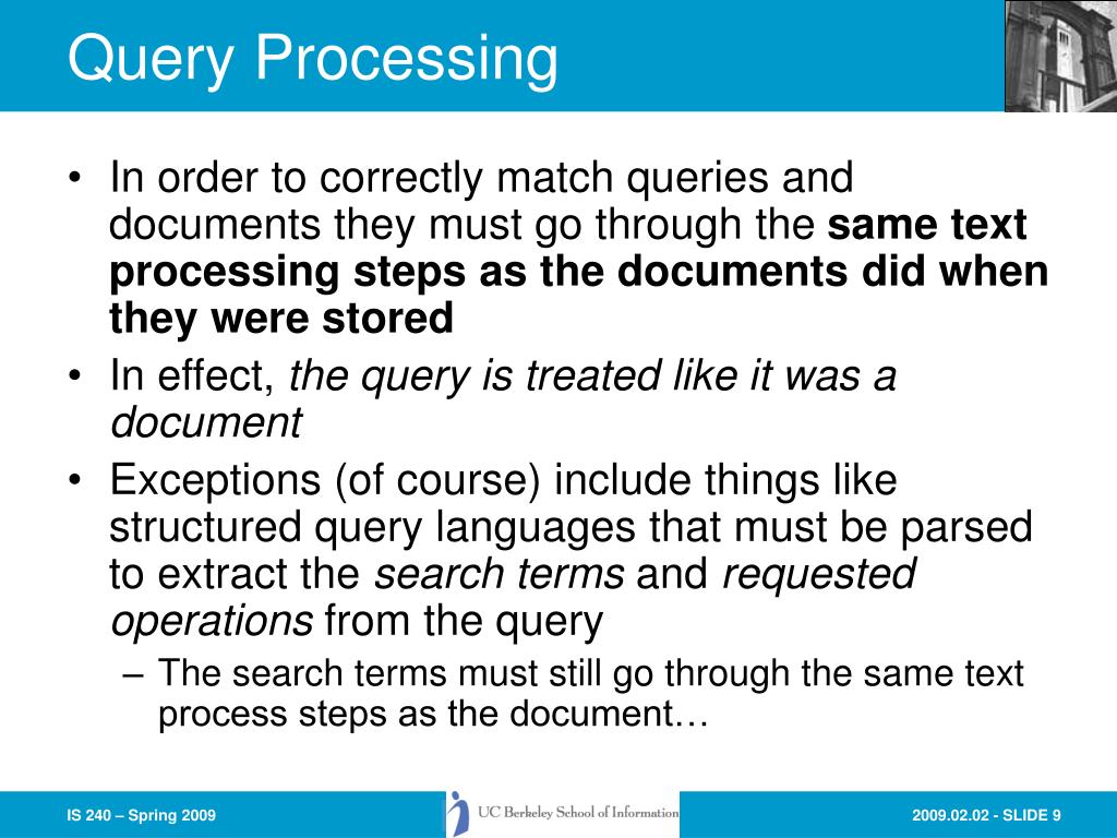 Query Processing • In order to correctly match queries and documents they must go through the same text processing steps as the documents did when they were stored • In effect, the query is treated like it was a document • Exceptions (of course) include things like structured query languages that must be parsed to extract the search terms and requested operations from the query • The search terms must still go through the same text process steps as the document…