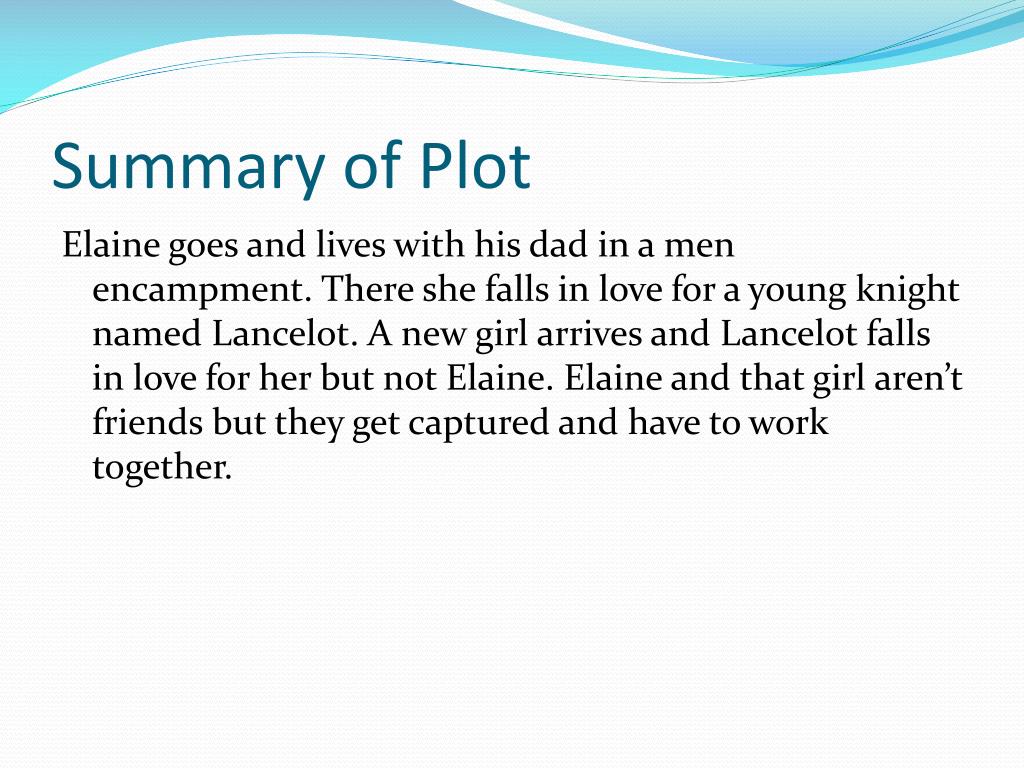 Summary of Plot Elaine goes and lives with his dad in a men encampment. There she falls in love for a young knight named Lancelot. A new girl arrives and Lancelot falls in love for her but not Elaine. Elaine and that girl aren’t friends but they get captured and have to work together.