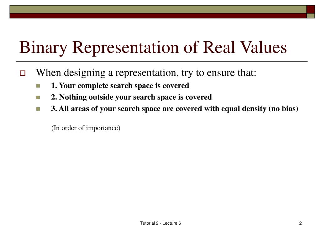 Binary Representation of Real Values • When designing a representation, try to ensure that: • 1. Your complete search space is covered • 2. Nothing outside your search space is covered • 3. All areas of your search space are covered with equal density (no bias) (In order of importance) Tutorial 2 - Lecture 6