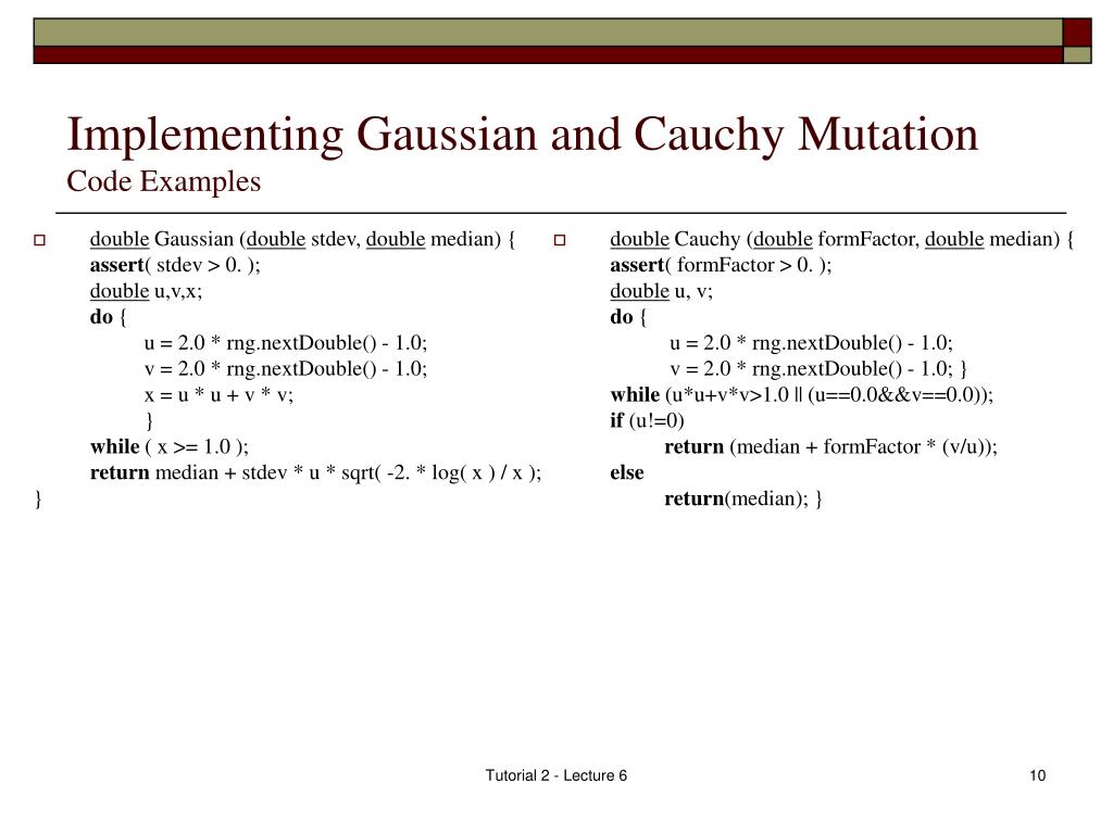 Implementing Gaussian and Cauchy MutationCode Examples • double Gaussian (double stdev, double median) { assert( stdev > 0. ); double u,v,x; do { u = 2.0 * rng.nextDouble() - 1.0; v = 2.0 * rng.nextDouble() - 1.0; x = u * u + v * v; } while ( x >= 1.0 ); return median + stdev * u * sqrt( -2. * log( x ) / x ); } • double Cauchy (double formFactor, double median) { assert( formFactor > 0. ); double u, v; do { u = 2.0 * rng.nextDouble() - 1.0; v = 2.0 * rng.nextDouble() - 1.0; } while (u*u+v*v>1.0 || (u==0.0&&v==0.0)); if (u!=0) return (median + formFactor * (v/u)); else return(median); } Tutorial 2 - Lecture 6