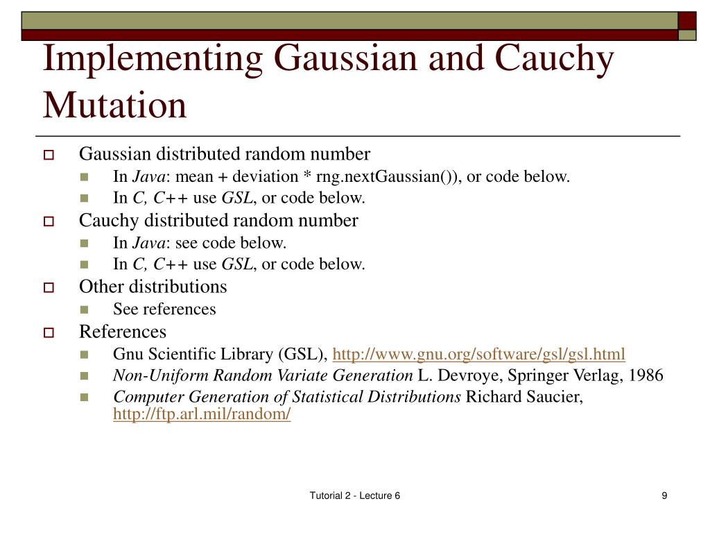 Implementing Gaussian and Cauchy Mutation • Gaussian distributed random number • In Java: mean + deviation * rng.nextGaussian()), or code below. • In C, C++ use GSL, or code below. • Cauchy distributed random number • In Java: see code below. • In C, C++ use GSL, or code below. • Other distributions • See references • References • Gnu Scientific Library (GSL), http://www.gnu.org/software/gsl/gsl.html • Non-Uniform Random Variate Generation L. Devroye, Springer Verlag, 1986 • Computer Generation of Statistical Distributions Richard Saucier, http://ftp.arl.mil/random/ Tutorial 2 - Lecture 6
