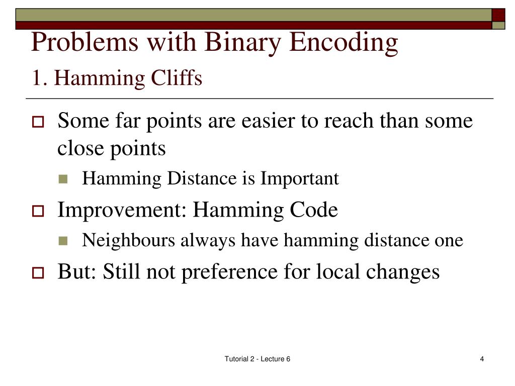 Problems with Binary Encoding1. Hamming Cliffs • Some far points are easier to reach than some close points • Hamming Distance is Important • Improvement: Hamming Code • Neighbours always have hamming distance one • But: Still not preference for local changes Tutorial 2 - Lecture 6