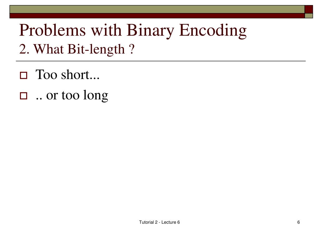 Problems with Binary Encoding2. What Bit-length ? • Too short... • .. or too long Tutorial 2 - Lecture 6