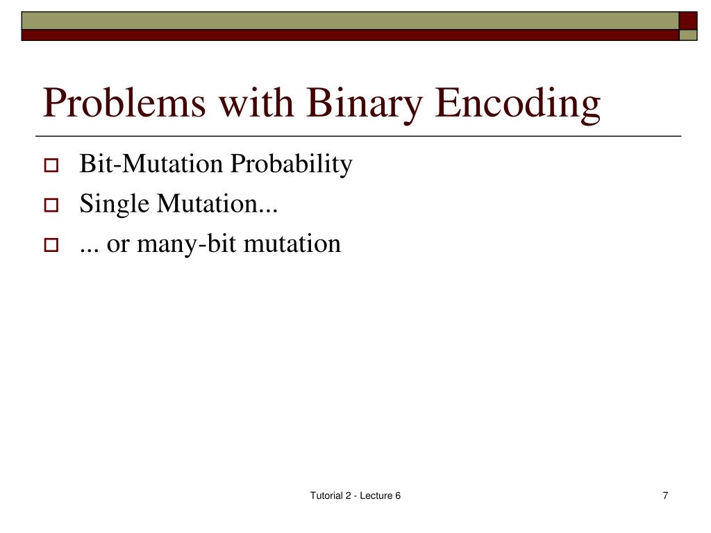 Problems with Binary Encoding • Bit-Mutation Probability • Single Mutation... • ... or many-bit mutation Tutorial 2 - Lecture 6