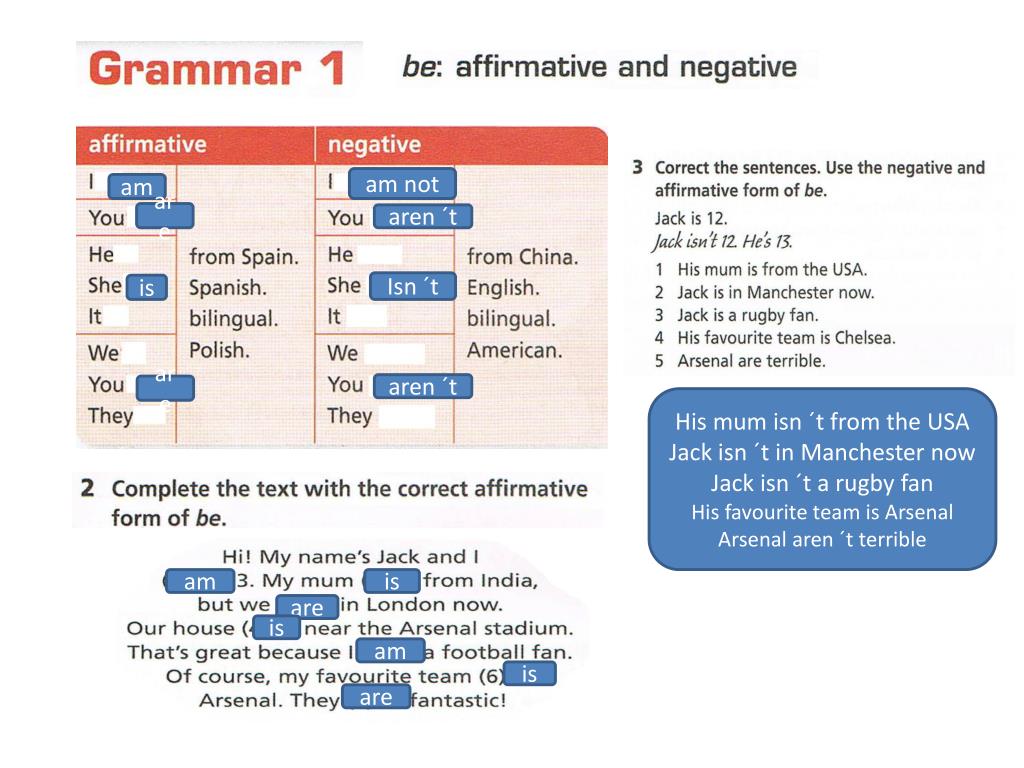 am not am are aren ´t Isn ´t is aren ´t are Hismumisn ´t fromthe USA Jack isn ´t in Manchester now Jack isn ´t a rugby fan Hisfavouriteteamis Arsenal Arsenal aren ´t terrible is am are is am is are
